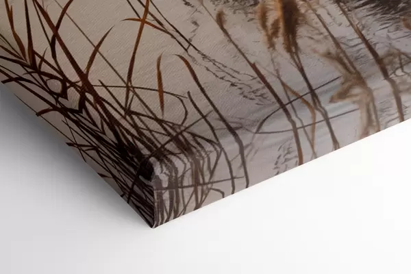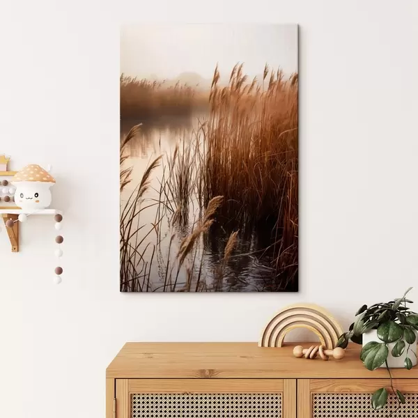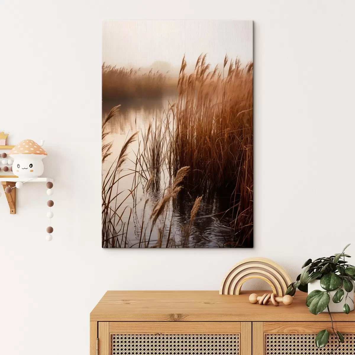 Schilderij Hoge rietstengels groeien in een watermassa, het water weerspiegelt het riet, mistige achtergrond, zacht licht, natuurtafereel Art. s46695