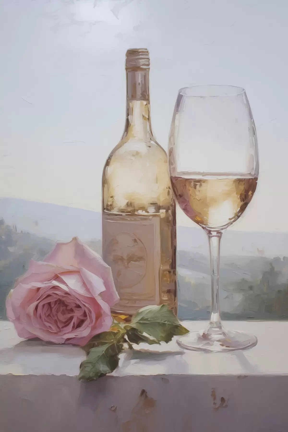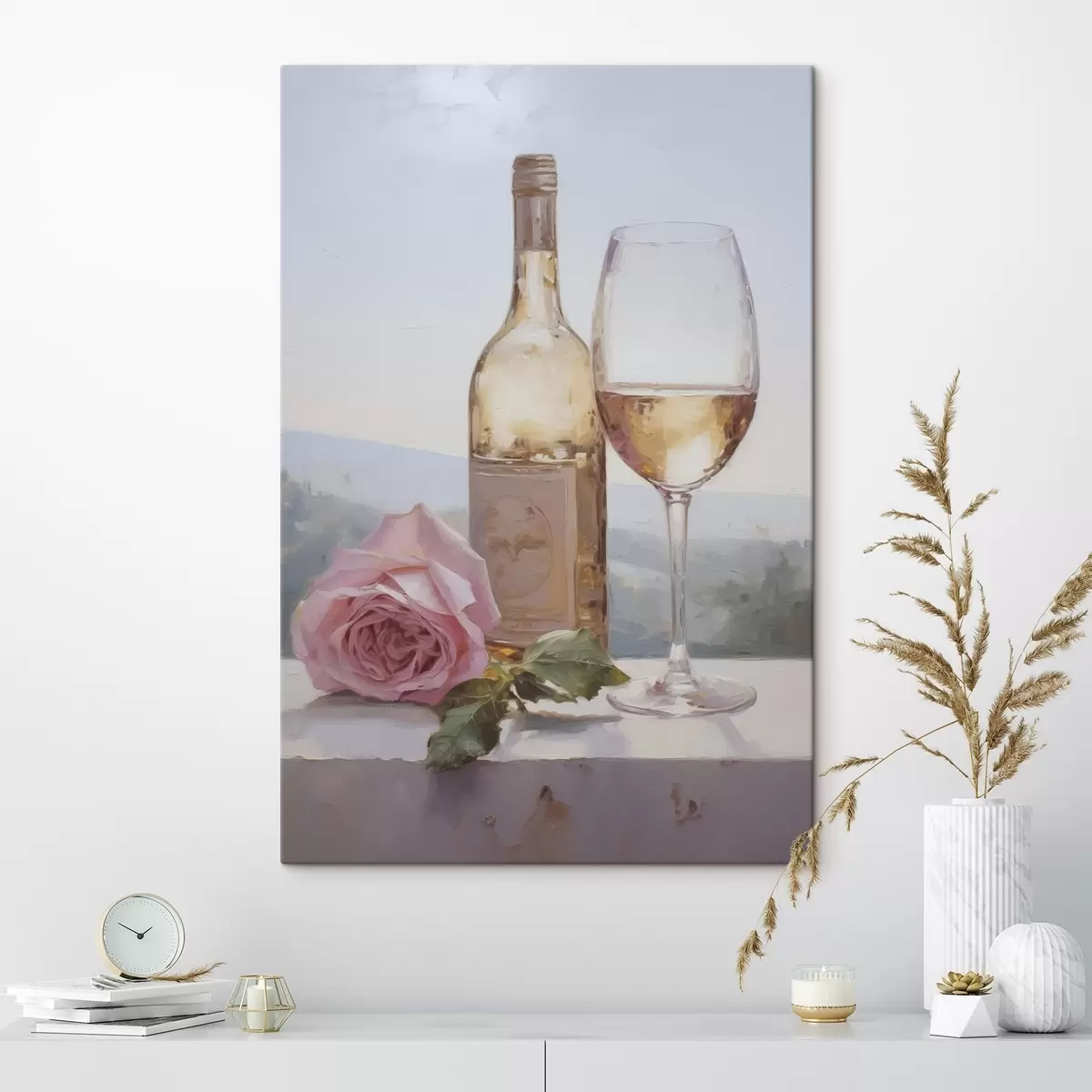 Schilderij Een fles en een glas wijn en een kleine hond met een bril, imitatie schilderij Art. s46721