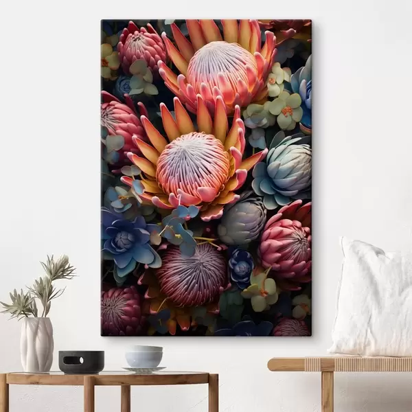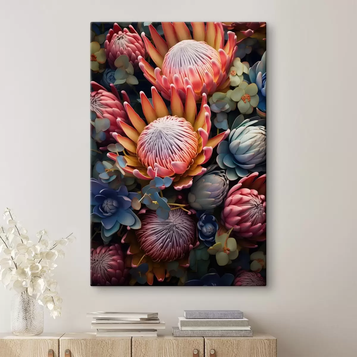 Schilderij Samenstelling van protea's, eucalyptus en vetplanten in een fotorealistische digitale kunststijl Art. s46925