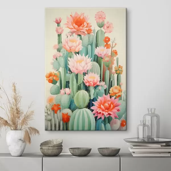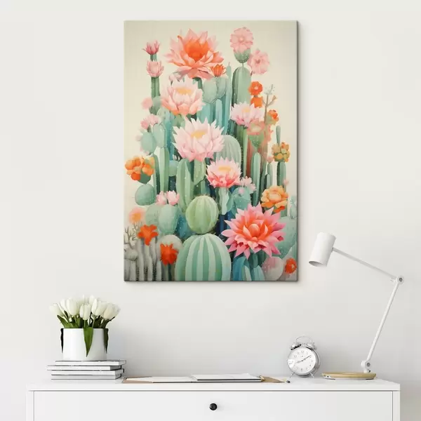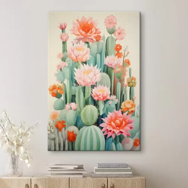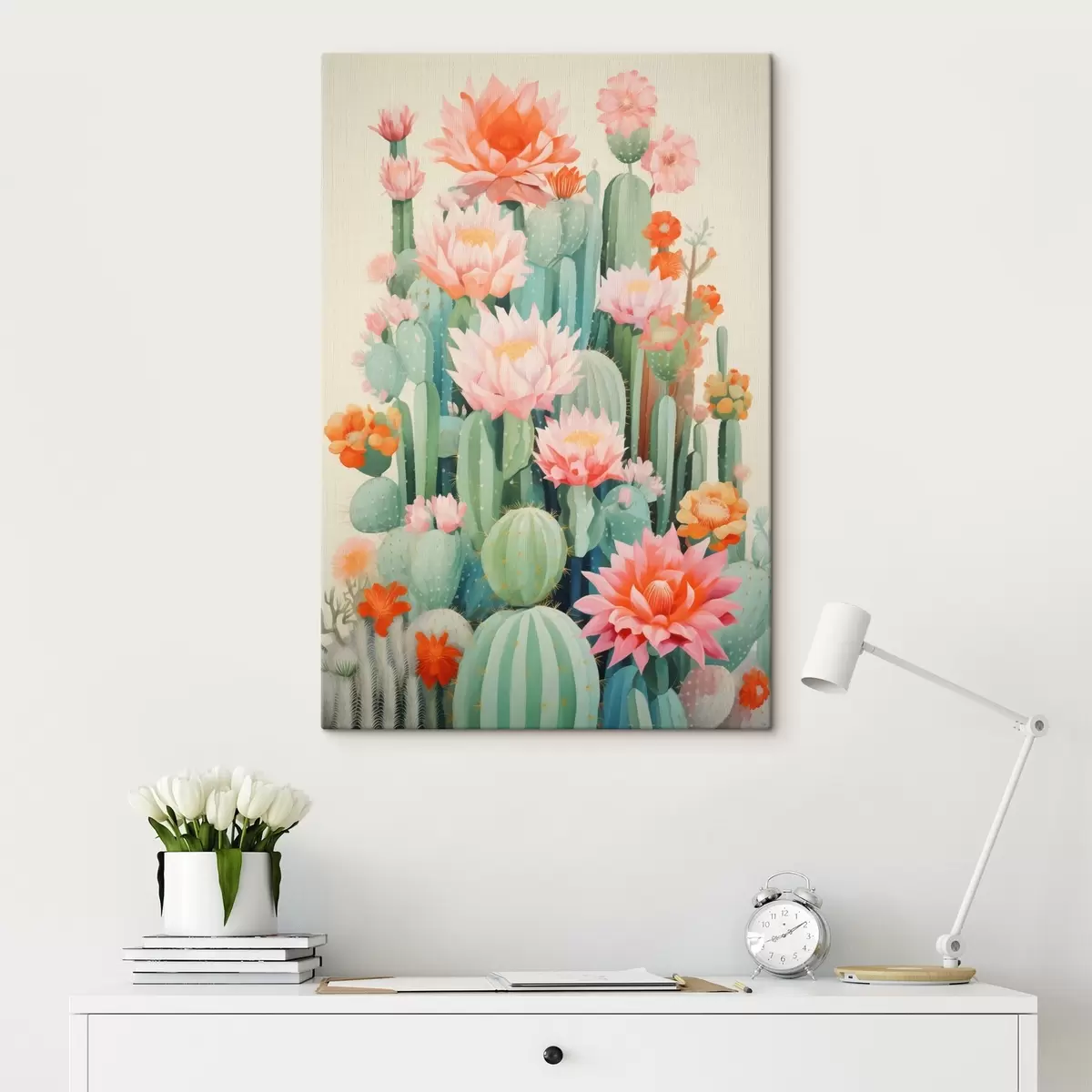 Schilderij Bloeiende cactussen met roze en oranje bloemen in illustratiestijl Art. s46934
