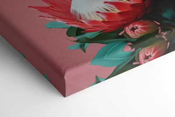 Schilderij Protea-boeket met rode bloemblaadjes en groen blad op een roze achtergrond Art. s46946