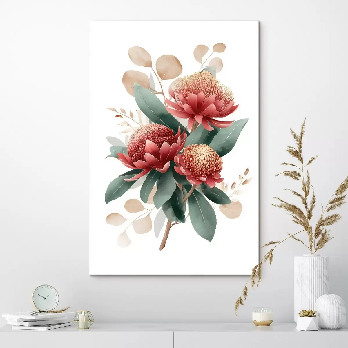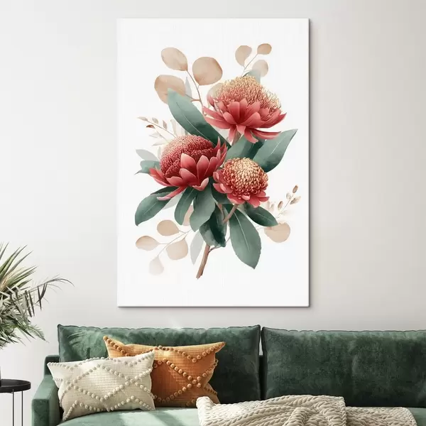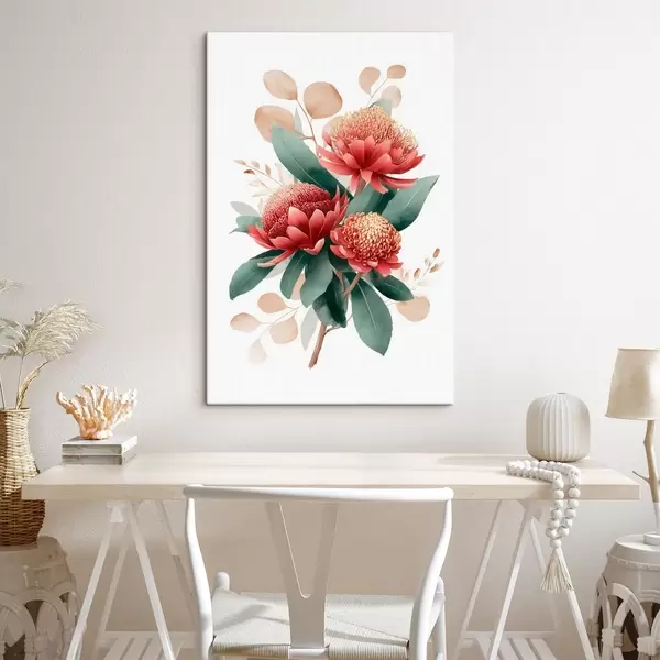Schilderij Expressief boeket van protea's en decoratief blad in moderne kunstillustratiestijl Art. s46954