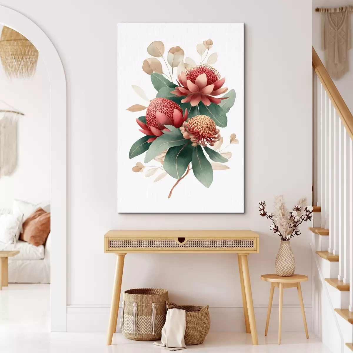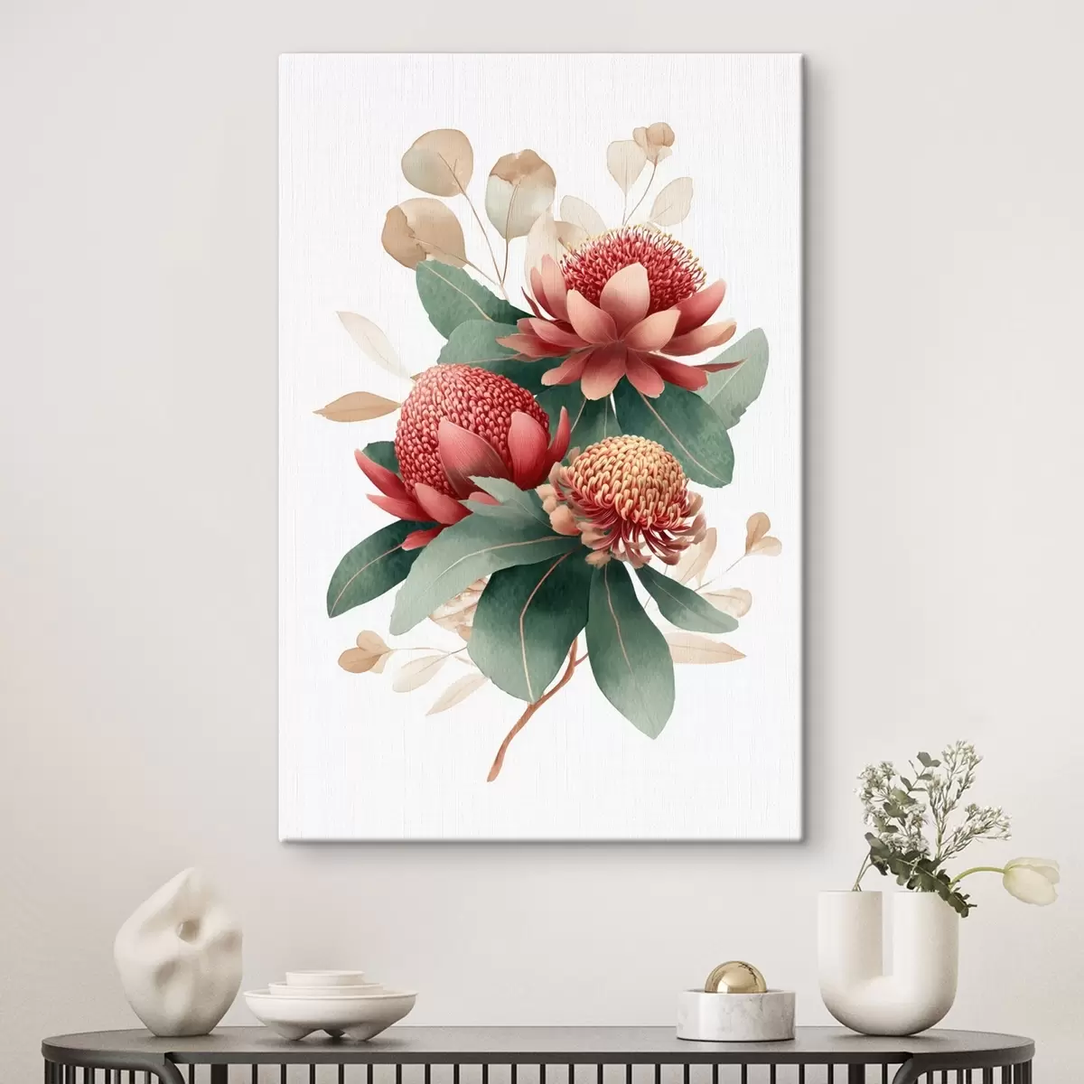 Schilderij Bloemstuk met grote protea's en eucalyptus in moderne digitale schilderstijl Art. s46955