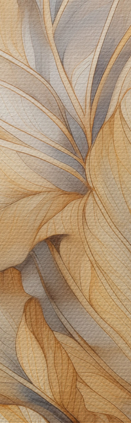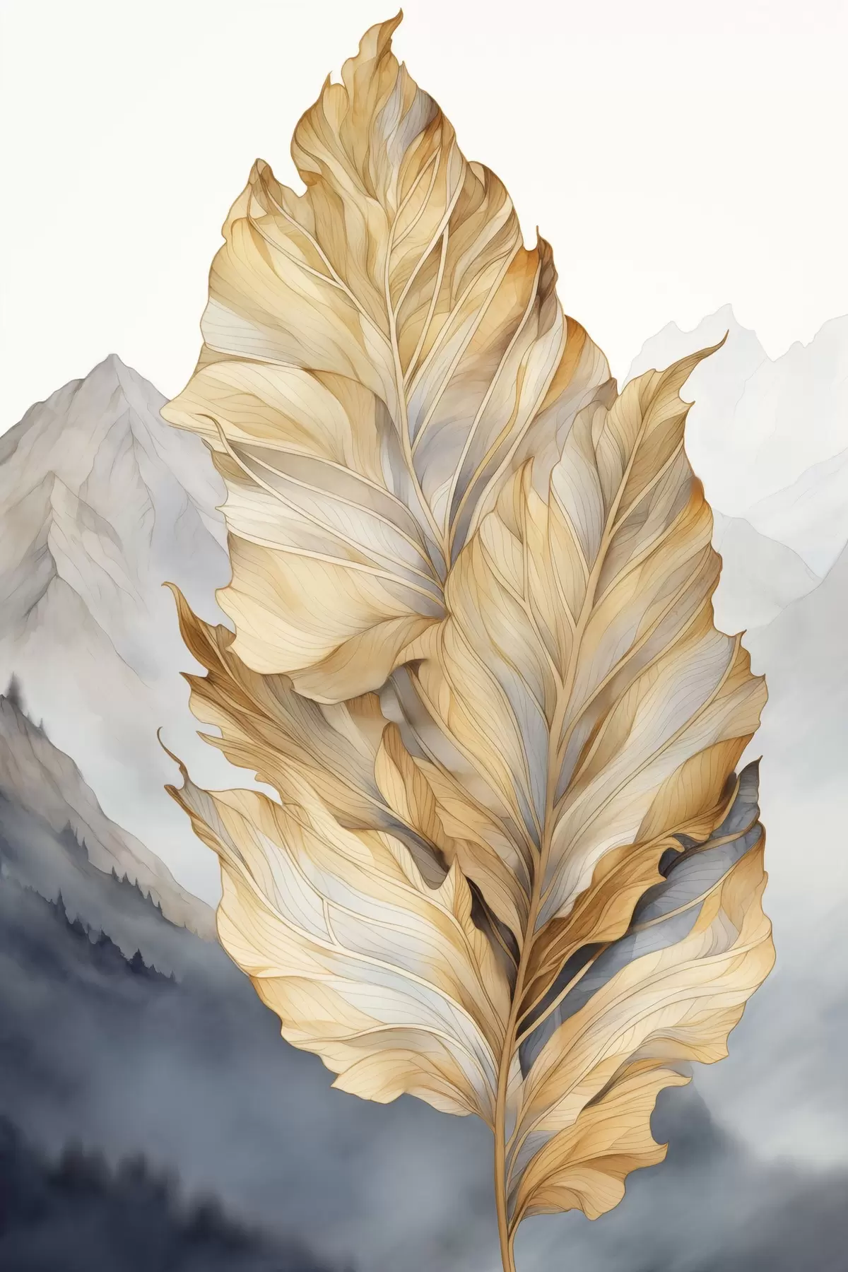 Schilderij Abstracte grote, gele en bruine bladeren met ingewikkelde details, tegen een berglandschap Art. s47022