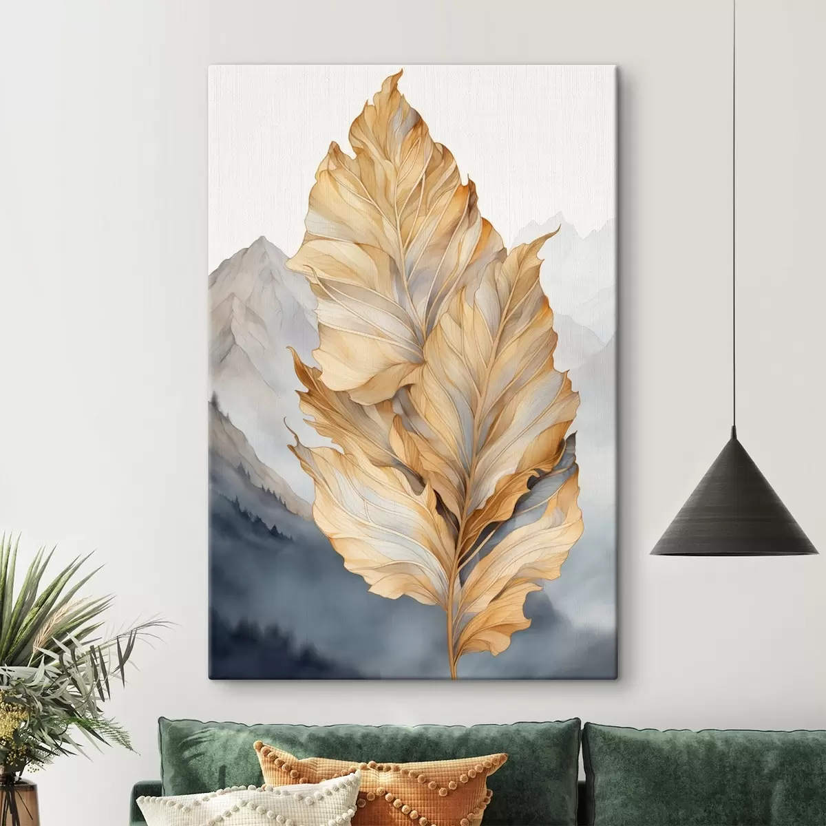 Schilderijen Abstracte grote, gele en bruine bladeren met ingewikkelde details, tegen een berglandschap s47022