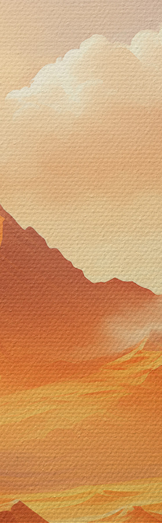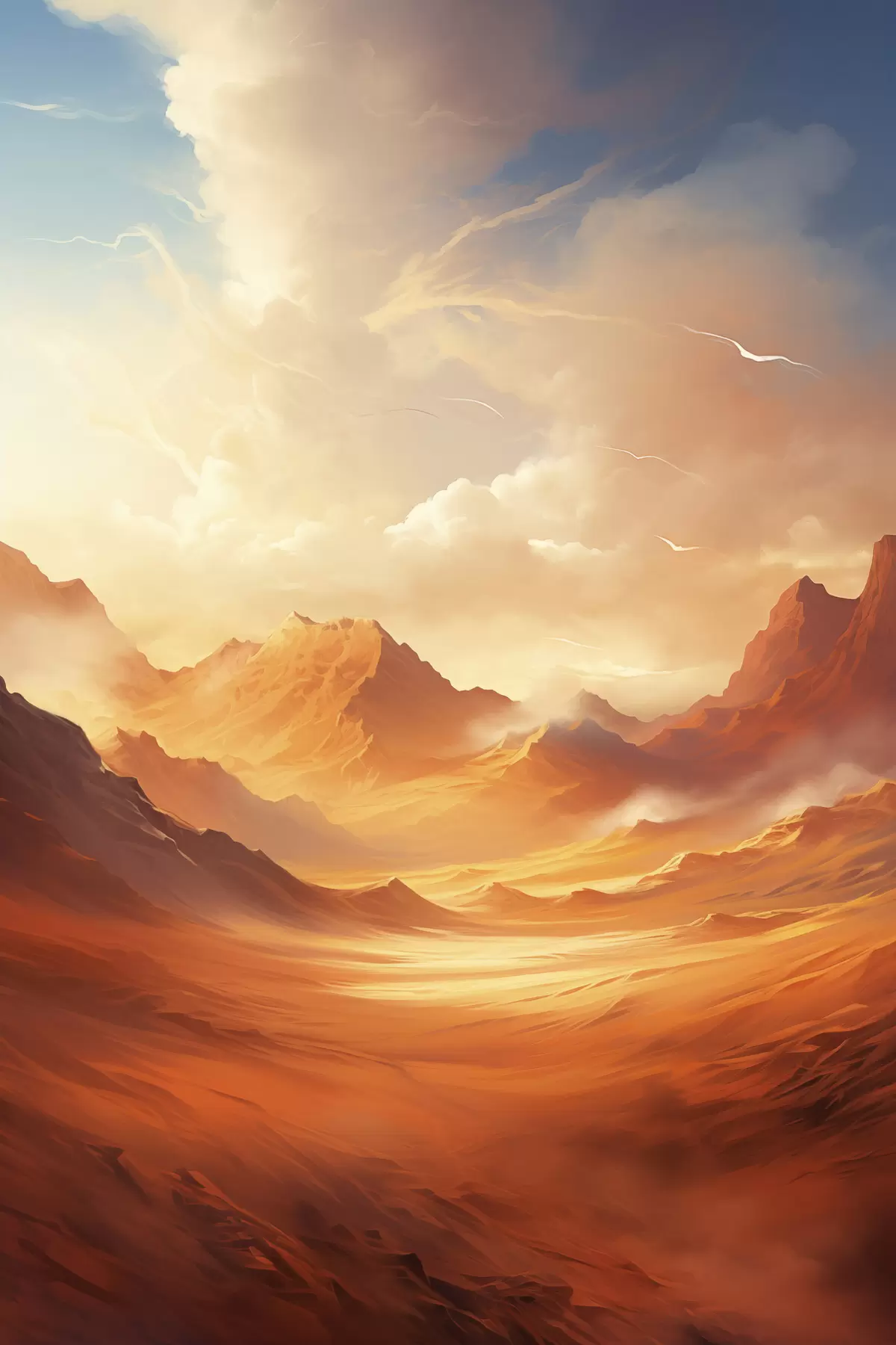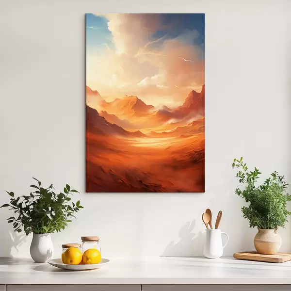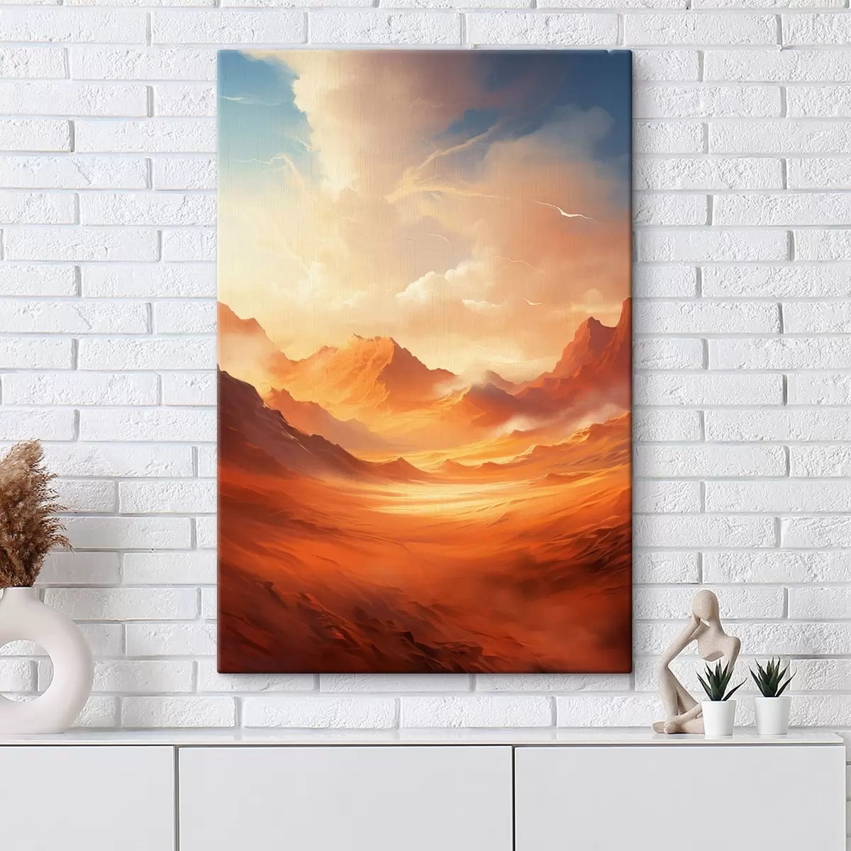 Schilderij Een uitgestrekt, oranje woestijnlandschap met torenhoge, rotsachtige bergen onder een wazige, zonovergoten hemel met dunne wolken. Art. s47028