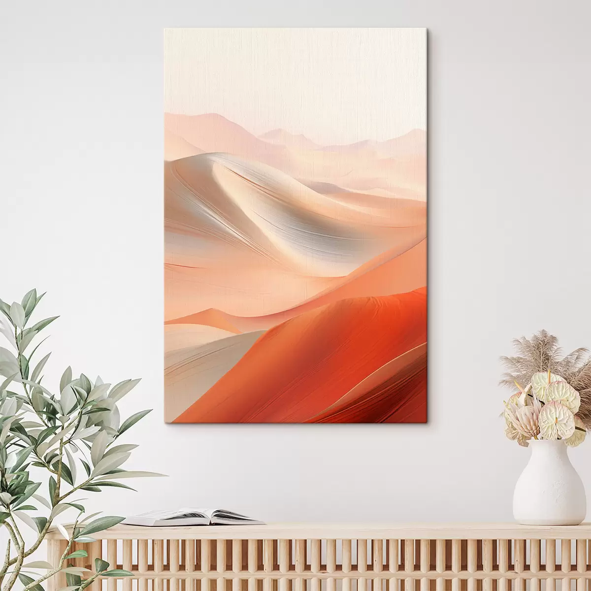 Schilderijen Abstract woestijnlandschap met vloeiende zandduinen in warme oranje en witte tinten s47030