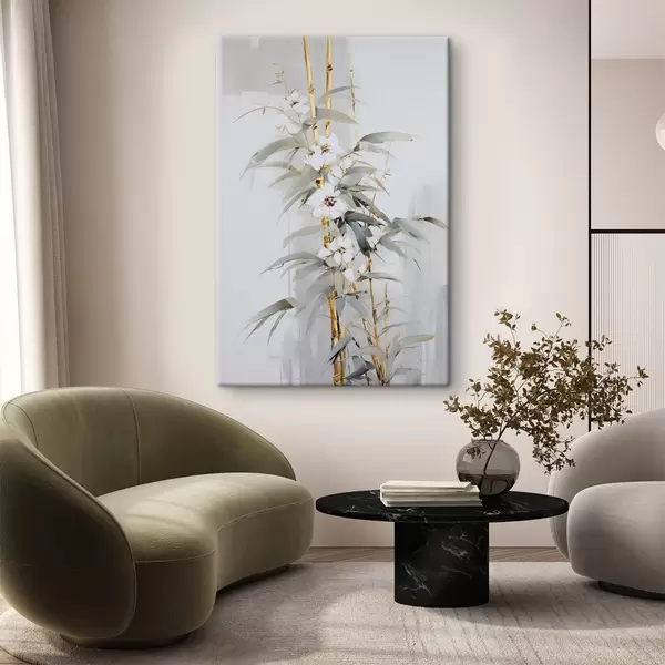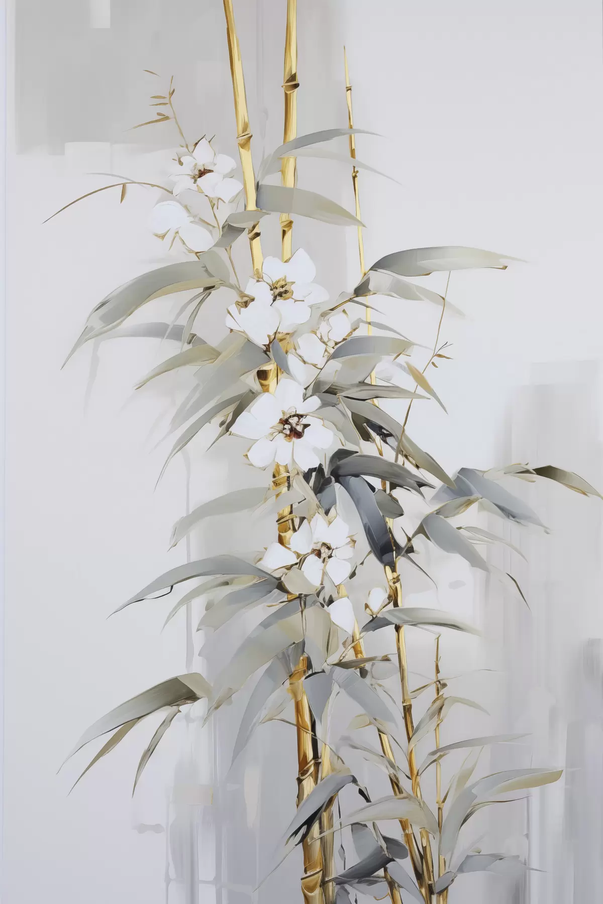 Schilderij Abstracte bamboestengels met gele accenten, delicate witte bloemen en lichtgroene bladeren, grijze achtergrond Art. s47039