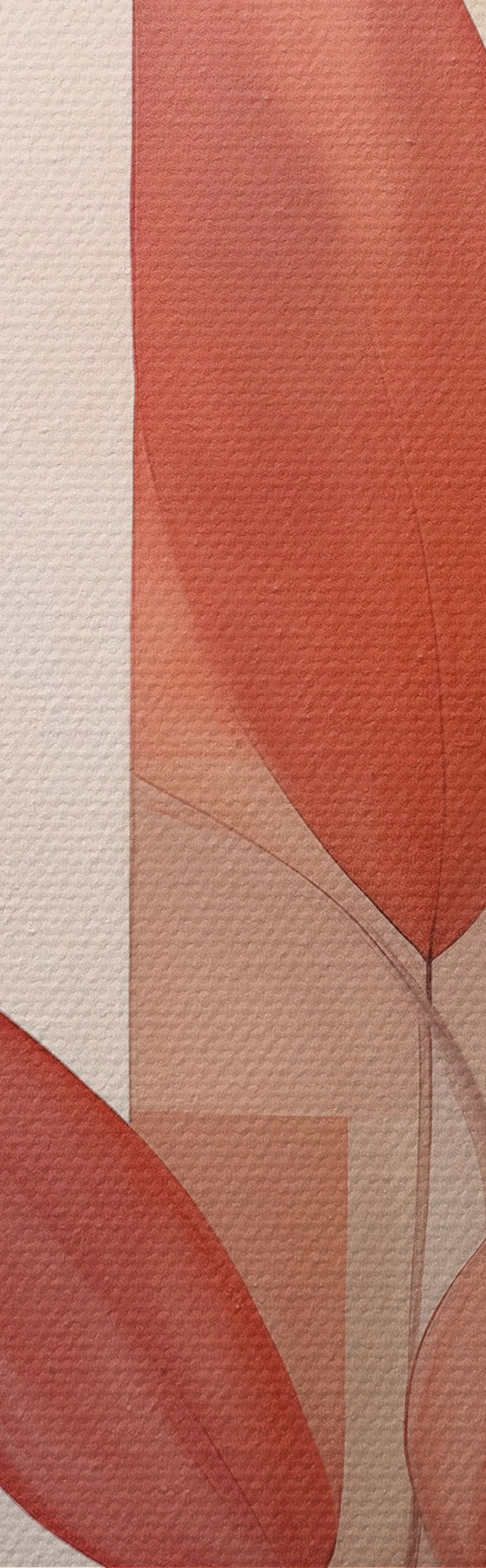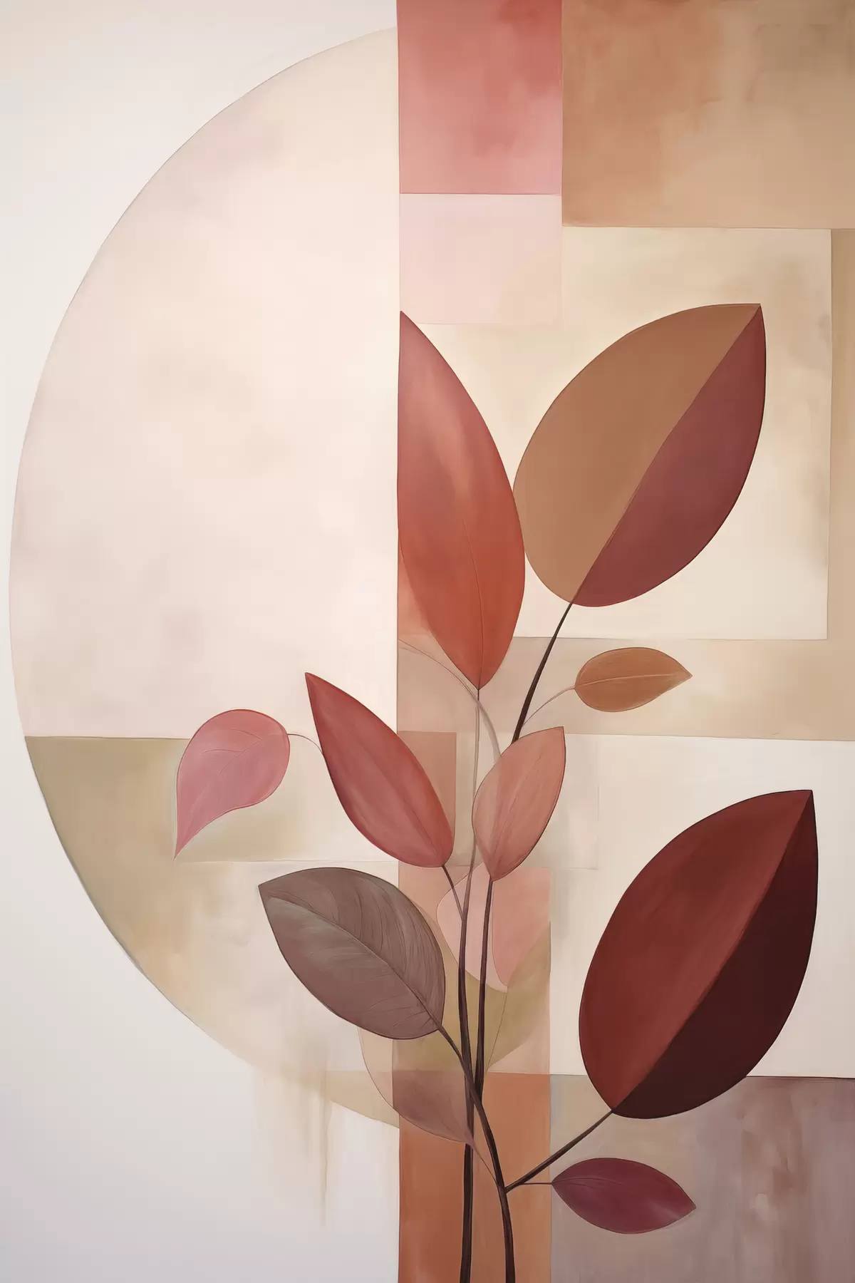 Schilderij Abstracte plant met rode bladeren tegen een achtergrond van geometrische vormen en zachte, gedempte kleuren Art. s47041