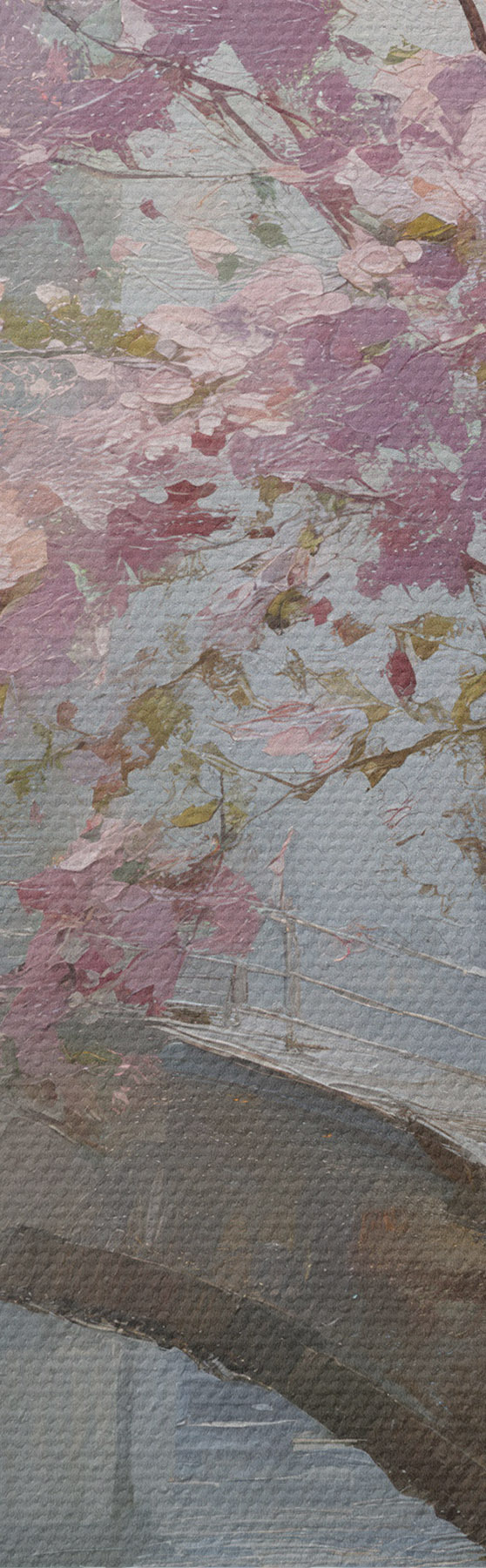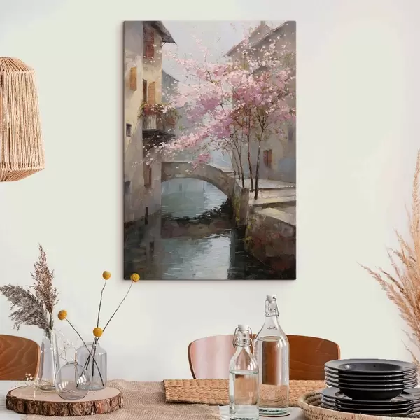 Schilderij romantisch stadsgezicht met een bloeiende boom in de stijl van een olieverfschilderij Art. s47127