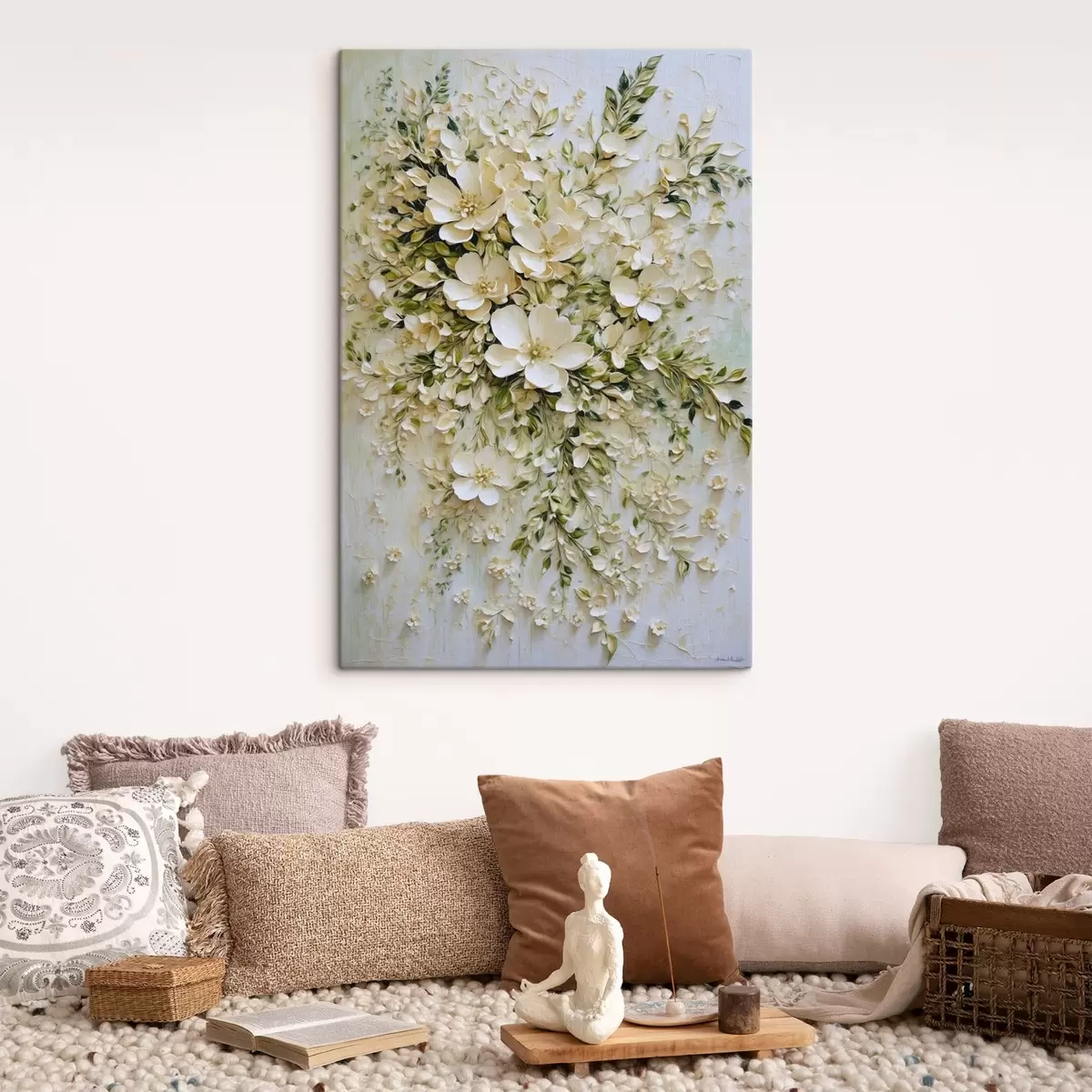 Schilderij Grote compositie van crèmekleurige bloemen en bladeren Art. s47267