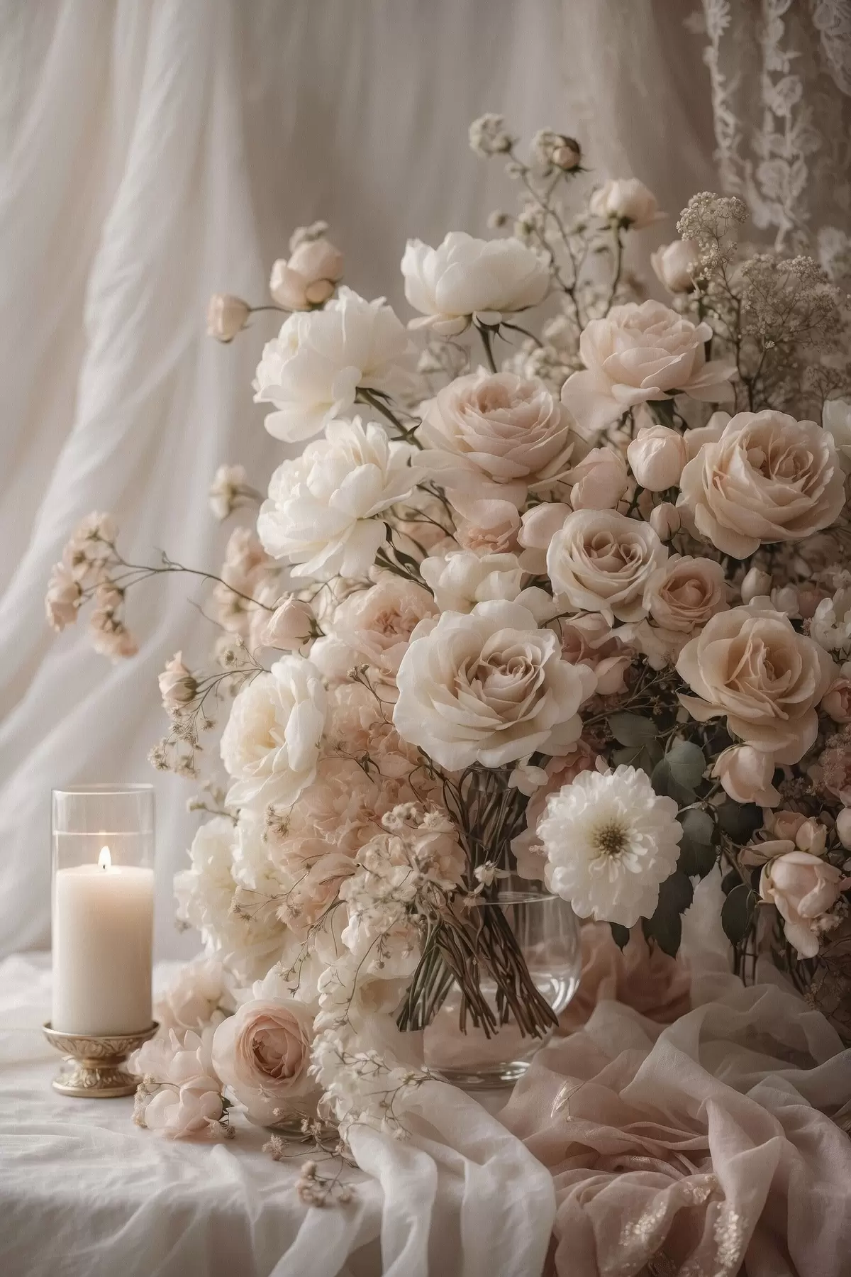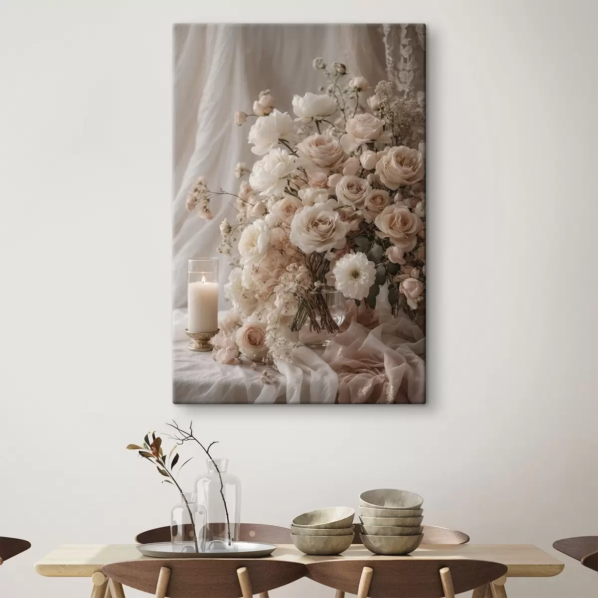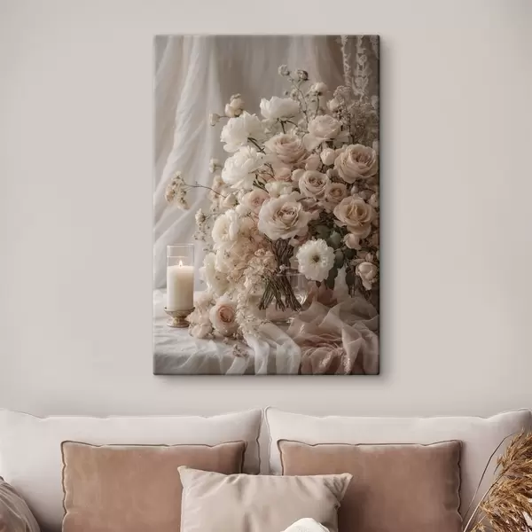 Schilderij Crèmekleurige bloemen naast een brandende kaars Art. s47281