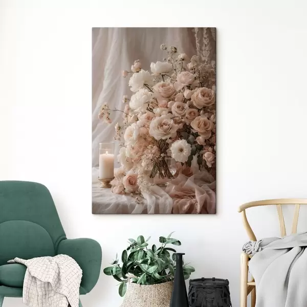 Schilderij Crèmekleurige bloemen naast een brandende kaars Art. s47281