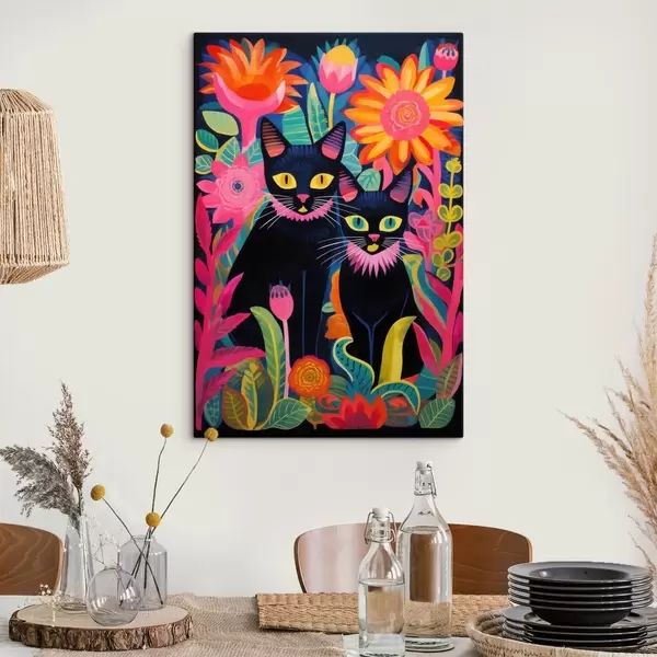 Schilderij Twee zwarte katten tussen heldere bloemen Art. s47299