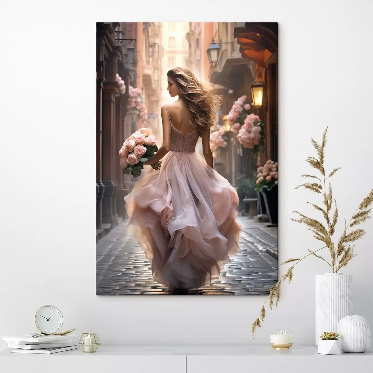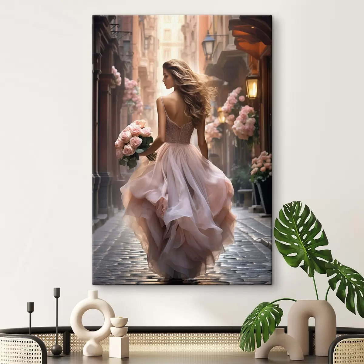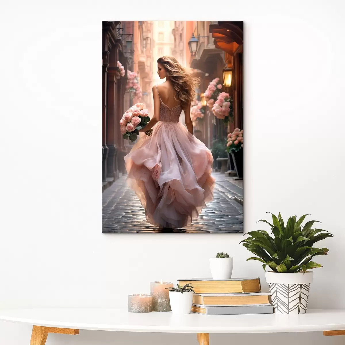 Schilderij Vrouw in een roze jurk loopt over straat Art. s47316