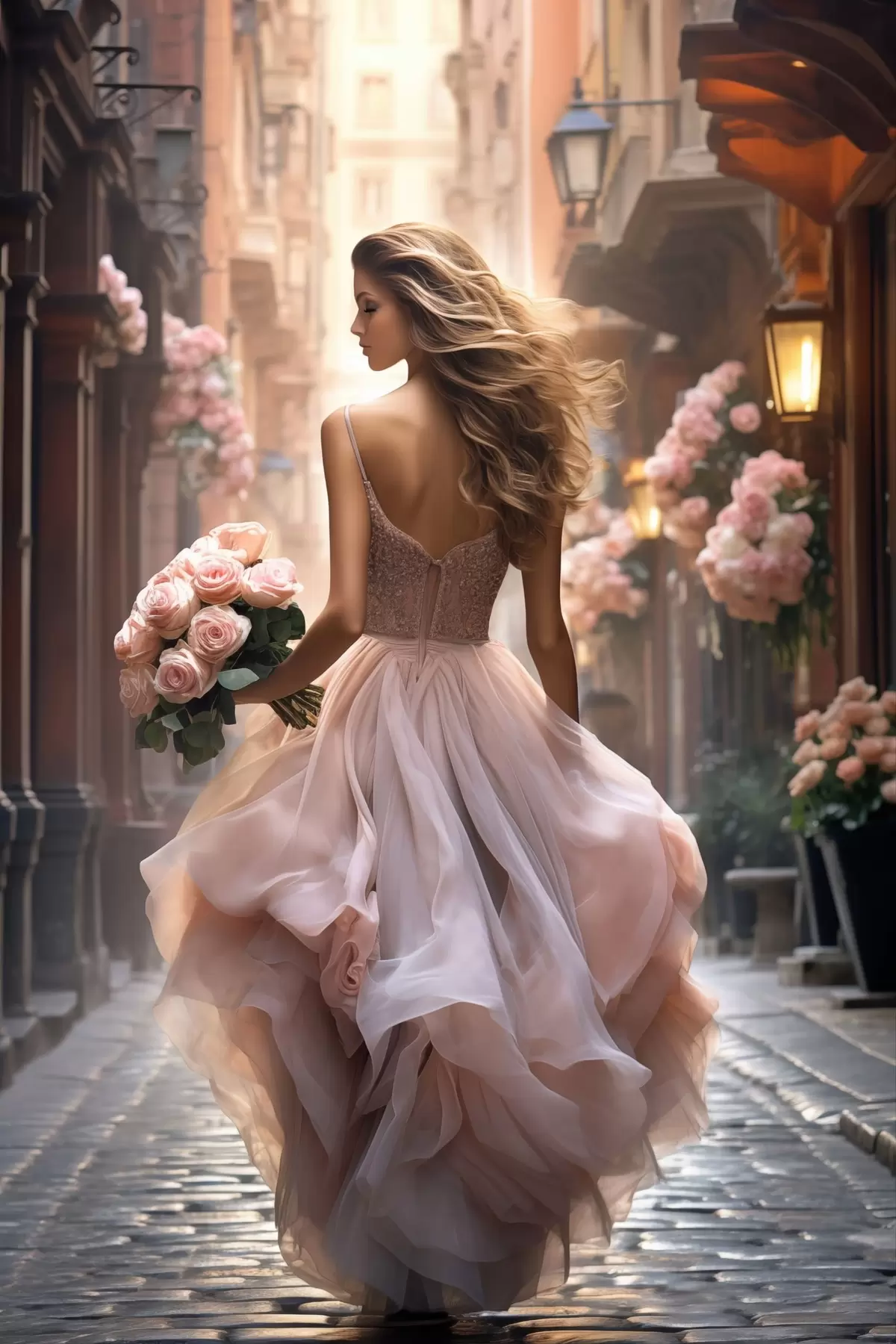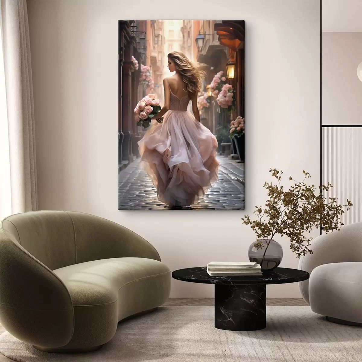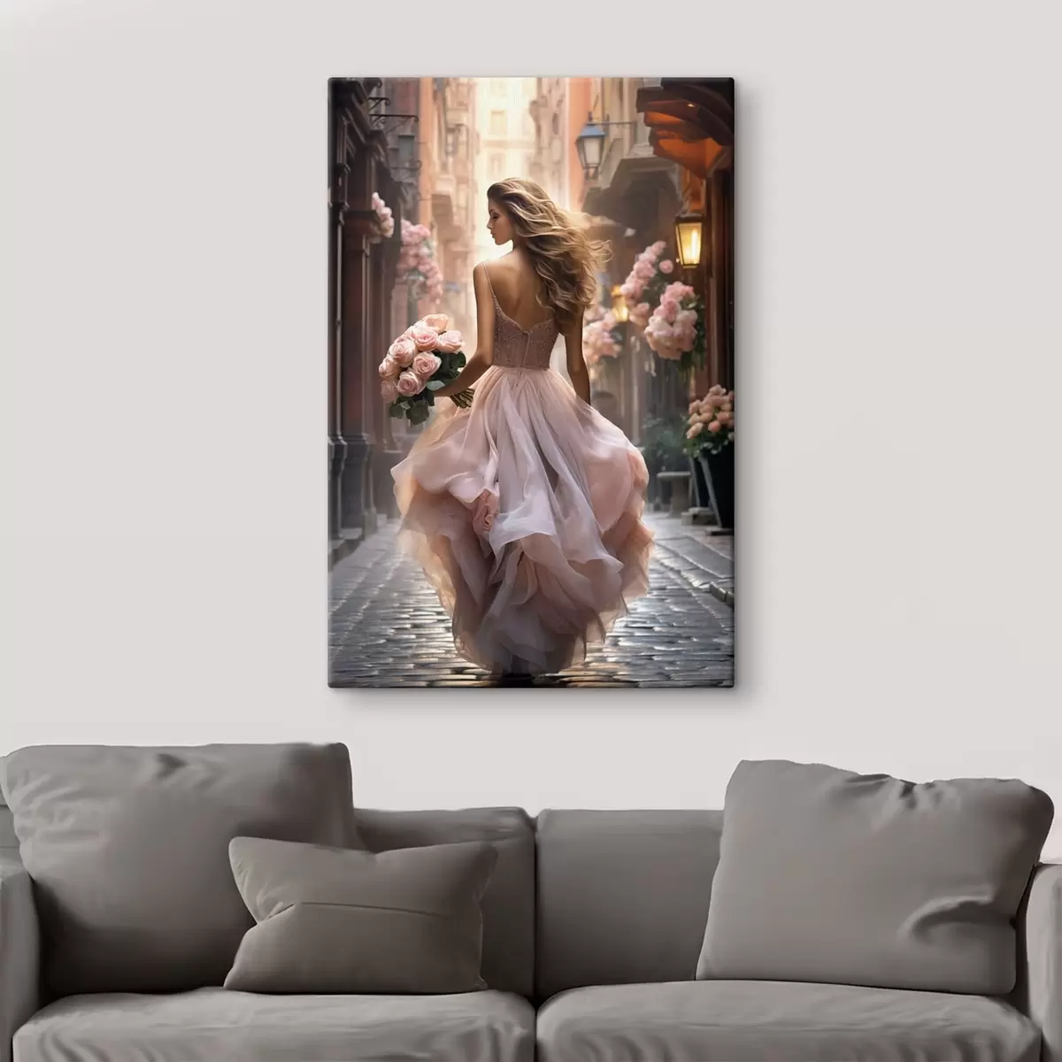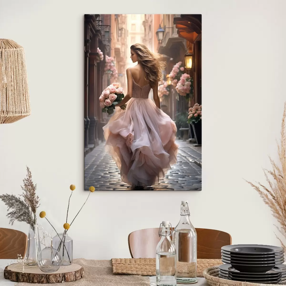 Schilderij Vrouw in een roze jurk loopt over straat Art. s47316