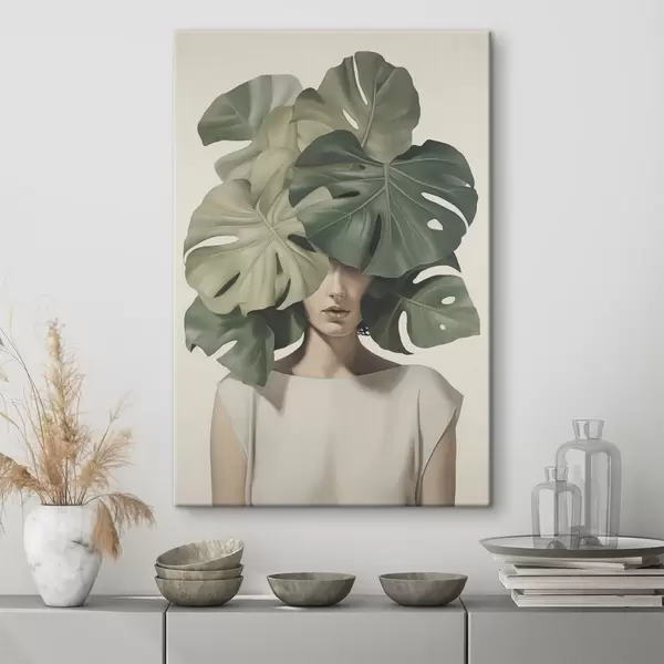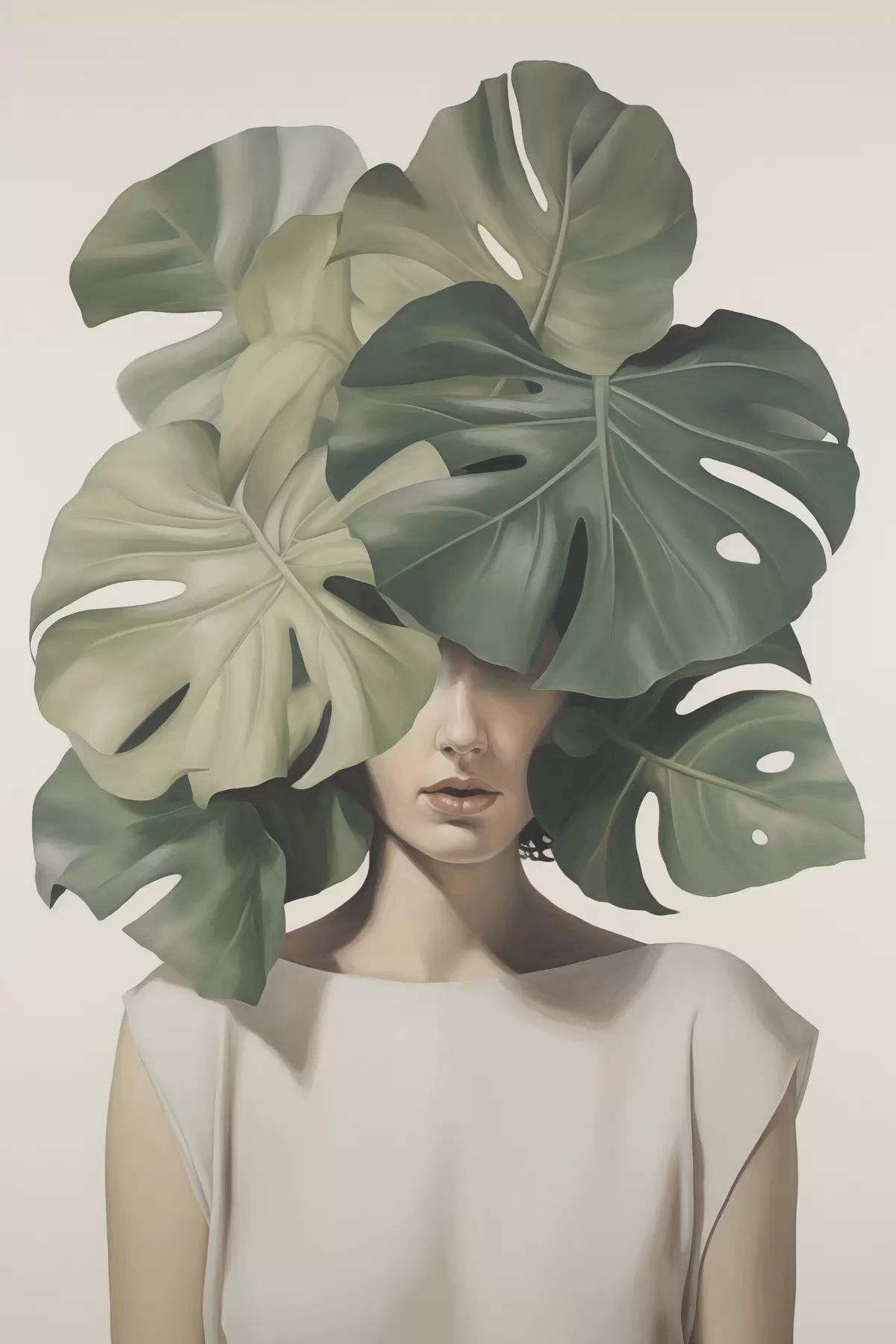 Schilderij Abstract portret van een meisje met monstera-bladeren Art. s47336
