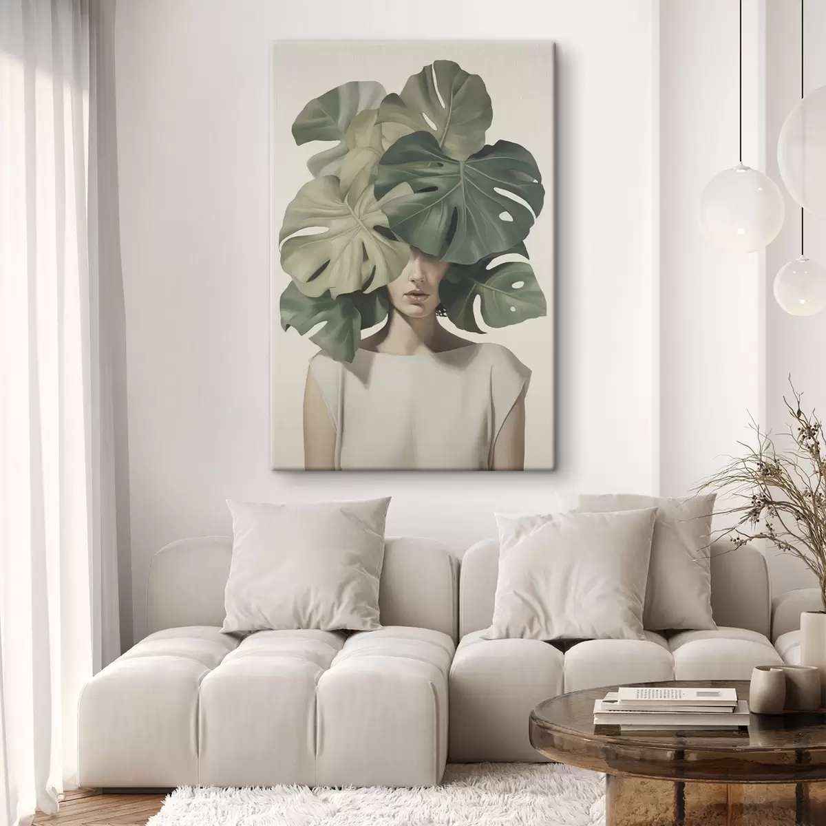 Schilderijen Abstract portret van een meisje met monstera-bladeren s47336
