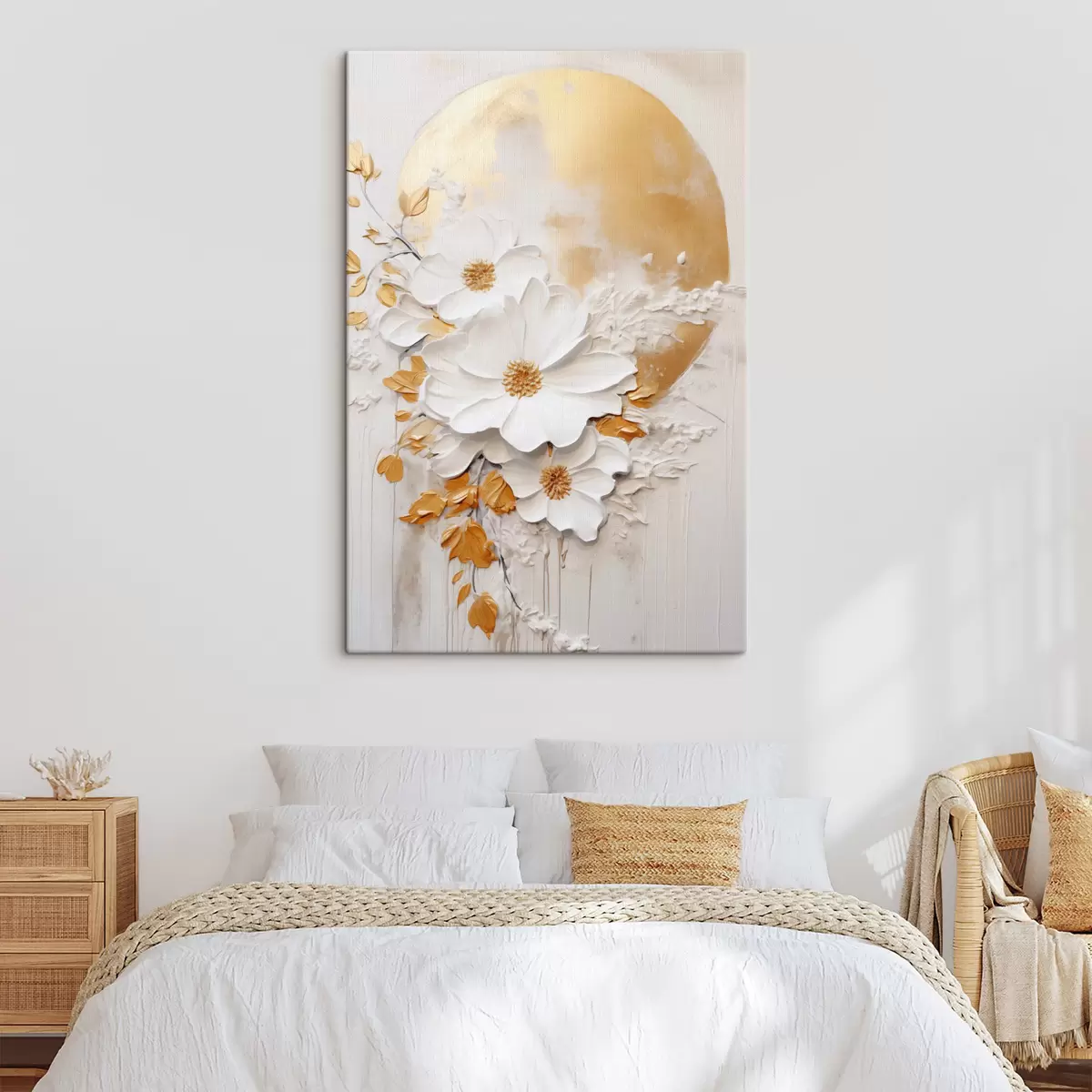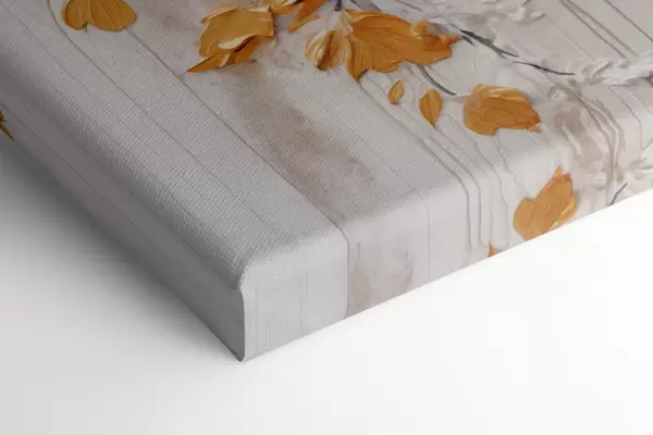 Schilderijen Witte bloemen met gele accenten en delicate bladeren tegen een gestructureerde achtergrond, moderne kunst s47414