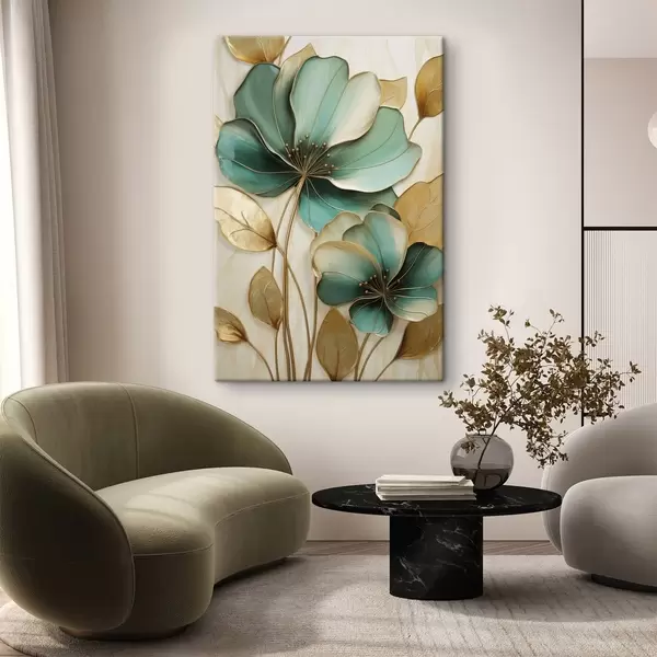 Schilderijen Grote blauwgroene en gele bloemen met contouren, omgeven door gele bladeren tegen een abstracte achtergrond s47418