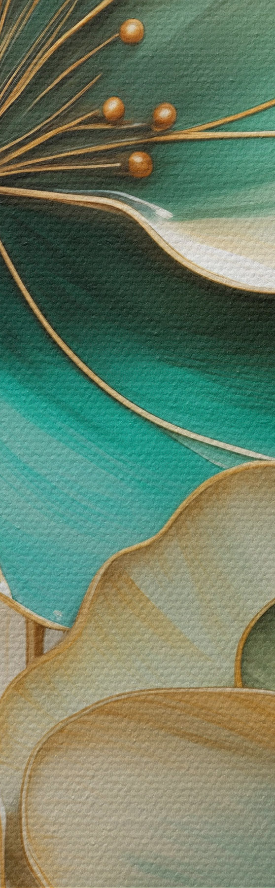 Schilderij Grote blauwgroene en gele bloemen met contouren, omgeven door gele bladeren tegen een abstracte achtergrond Art. s47418