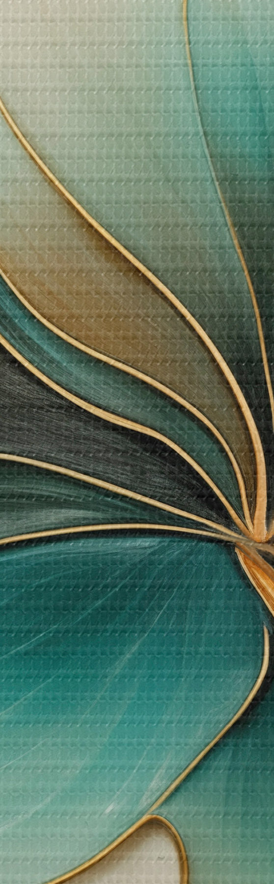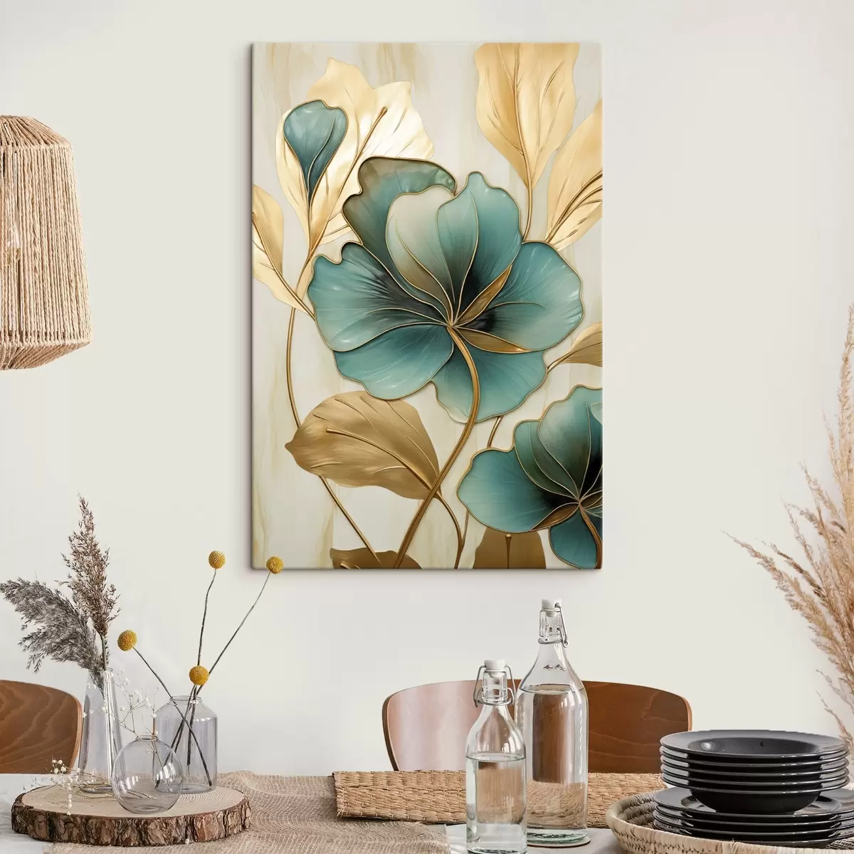 Schilderij Grote blauwgroene en gele bloemen met contouren, omgeven door gele bladeren tegen een abstracte achtergrond Art. s47419