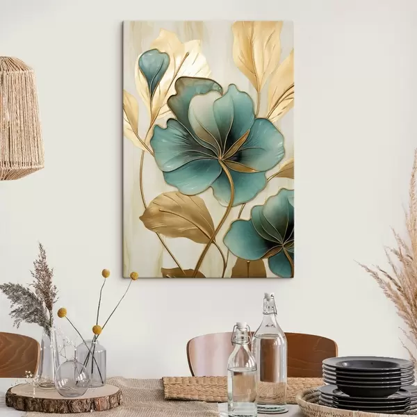 Schilderijen Grote blauwgroene en gele bloemen met contouren, omgeven door gele bladeren tegen een abstracte achtergrond s47419