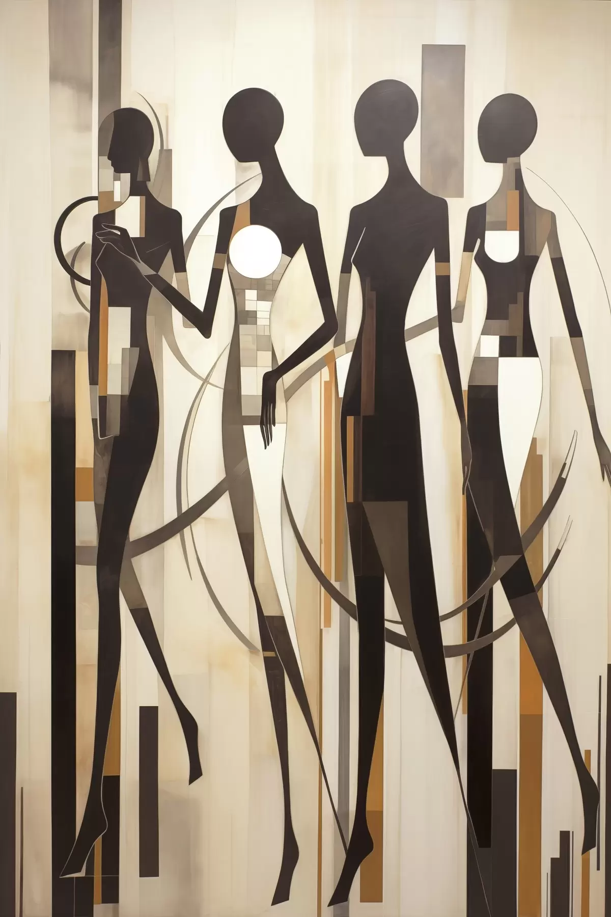 Schilderij Gestileerde vrouwelijke figuren met geometrische elementen tegen een abstracte achtergrond van verticale lijnen Art. s47423