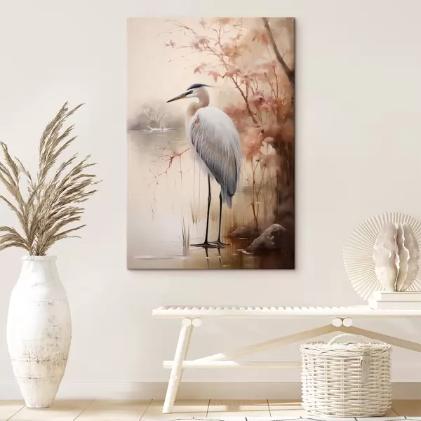 Schilderij Een reiger staat op een rots in een meer met hoog gras en bomen op de achtergrond. Art. s47427