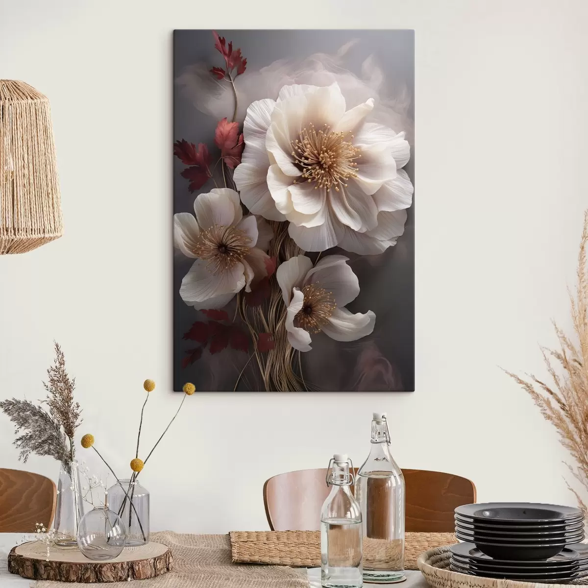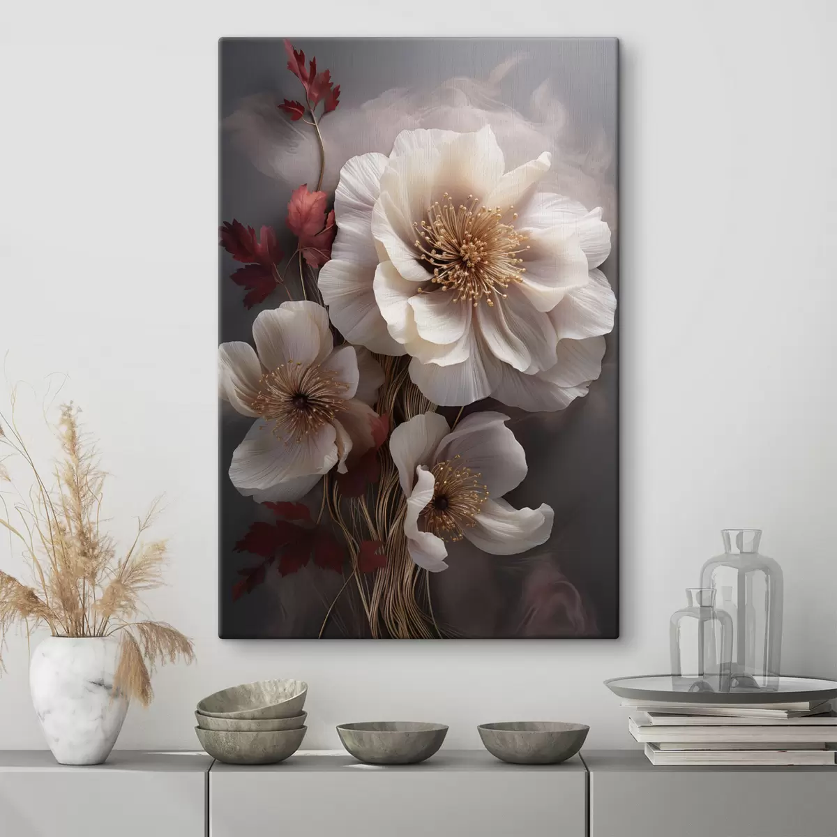 Schilderij Delicate pioenrozen met dunne, ijle bloemblaadjes, omgeven door donkerrode bladeren tegen een abstracte achtergrond Art. s47434