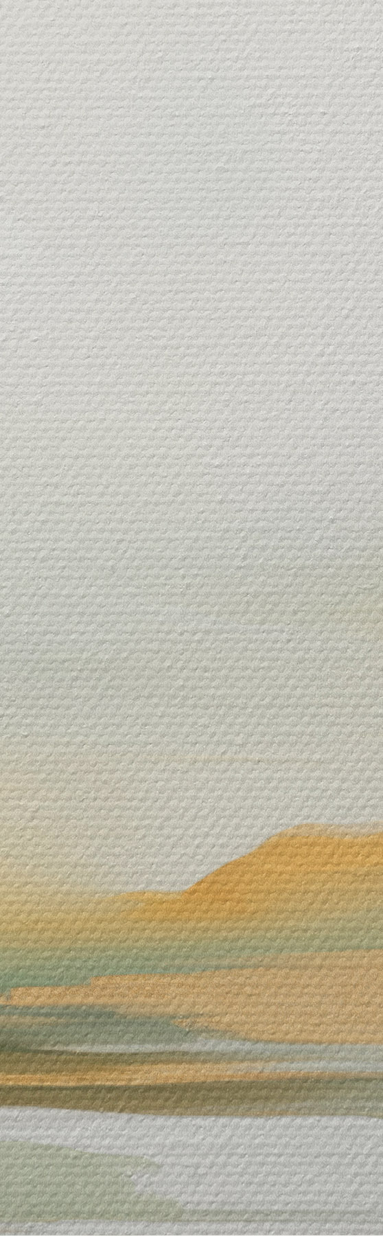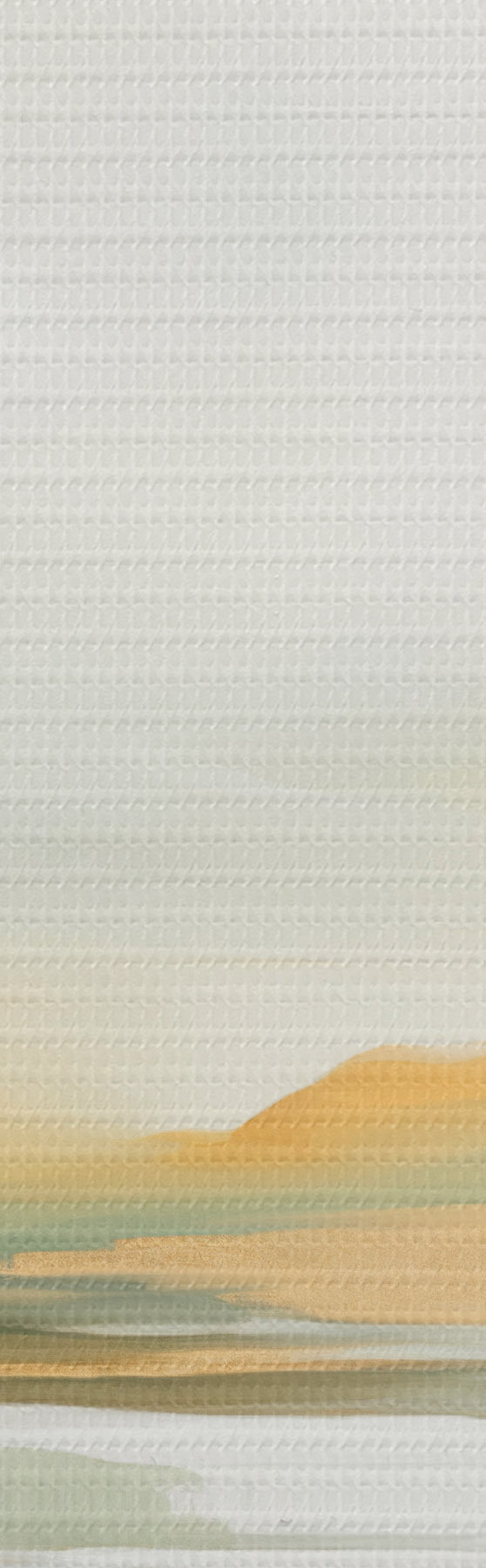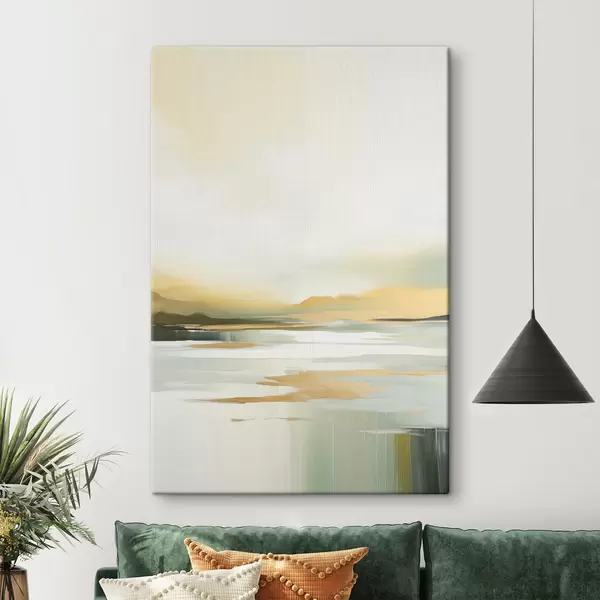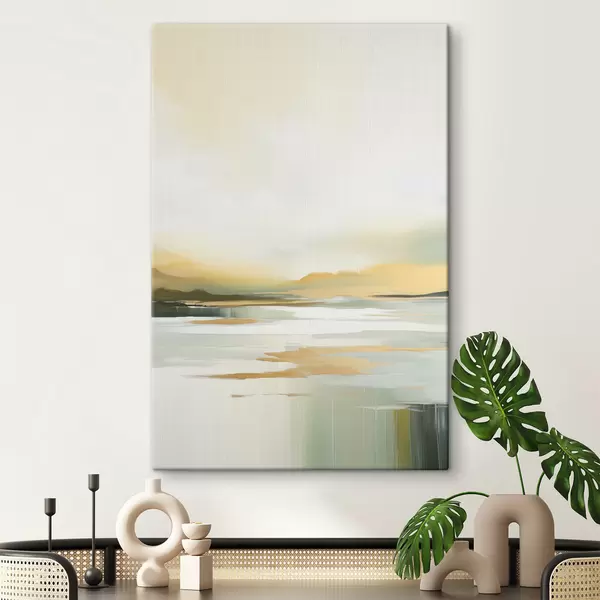 Schilderij Abstract landschap met gele en groene tinten, water dat de lucht en verre bergen weerspiegelt, bleke, wazige lucht Art. s47439
