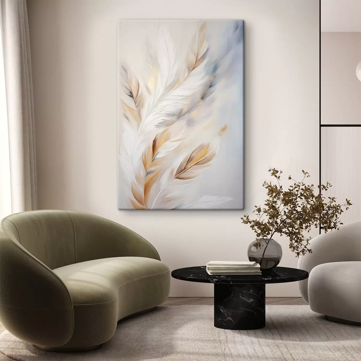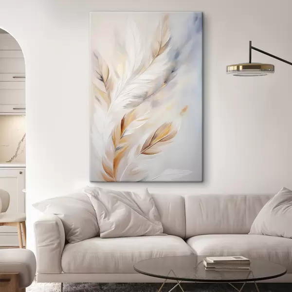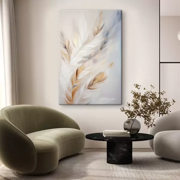 Schilderijen Grote, zachte veren met een mix van witte, gele en bruine tinten, tegen een lichte, abstracte achtergrond. s47443