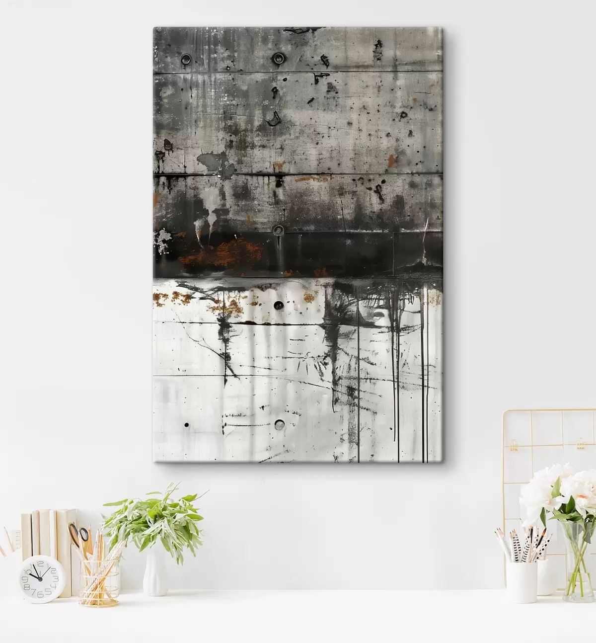 Je kunt het schilderij ophangen aan schroeven. Hiervoor leveren we bevestigingen bij onze foto's, zodat je de foto gemakkelijk kunt ophangen.