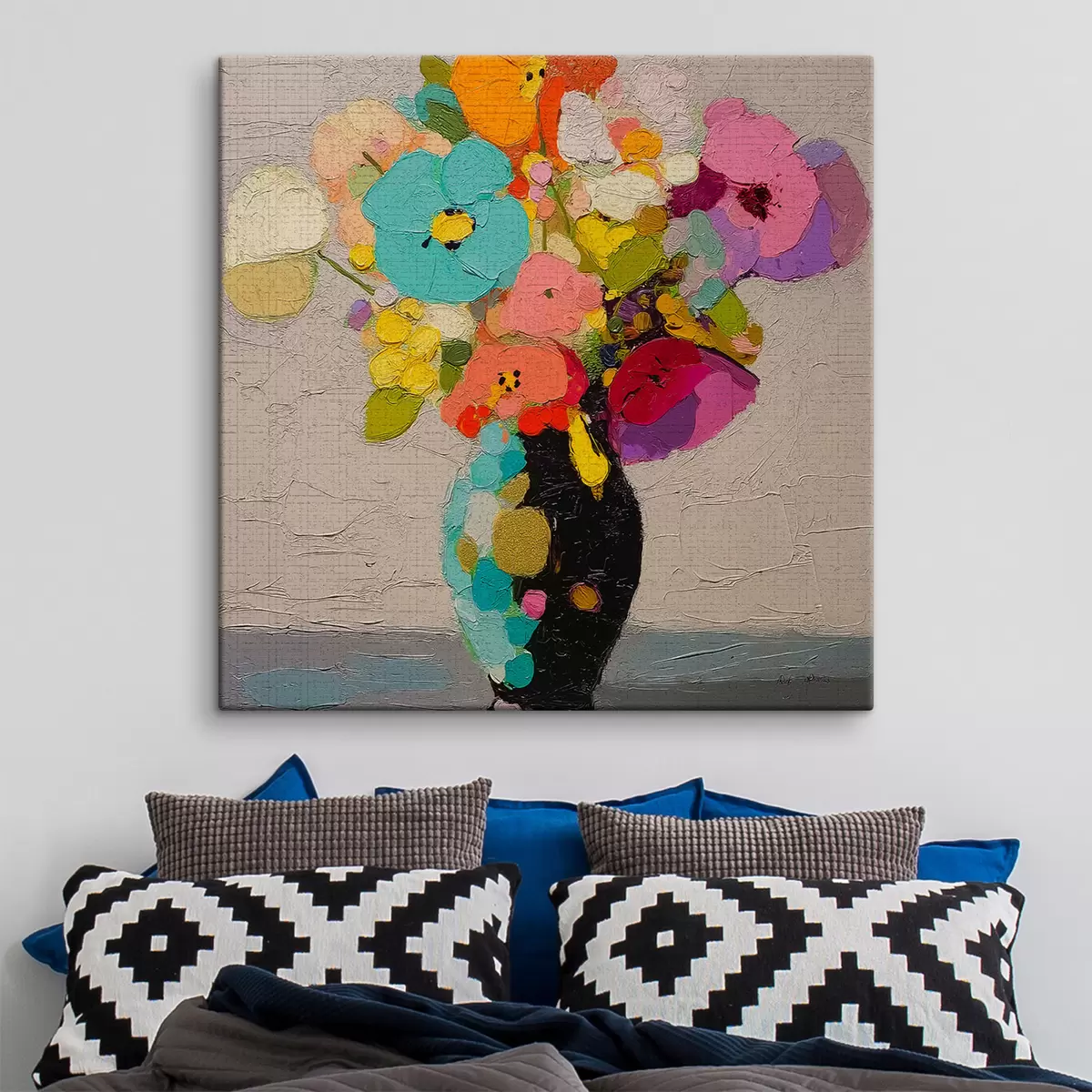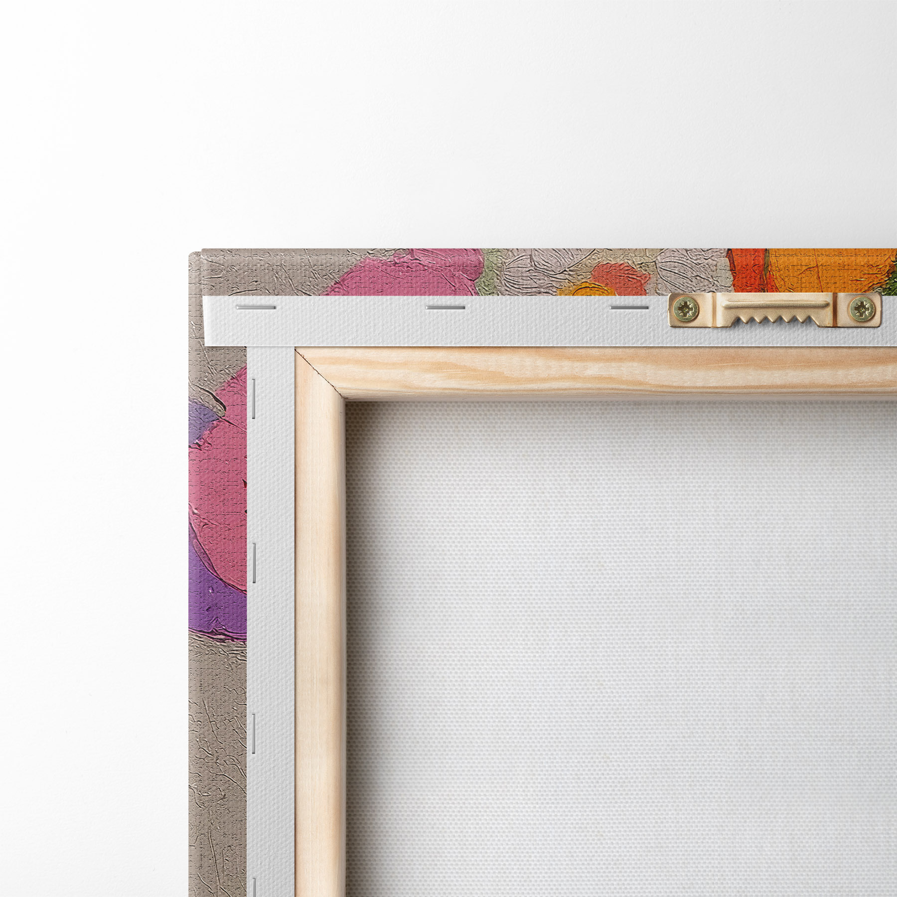 Het schilderij kan direct na ontvangst worden opgehangen. Het schilderij wordt opgespannen op een 2 cm breed houten spieraam.