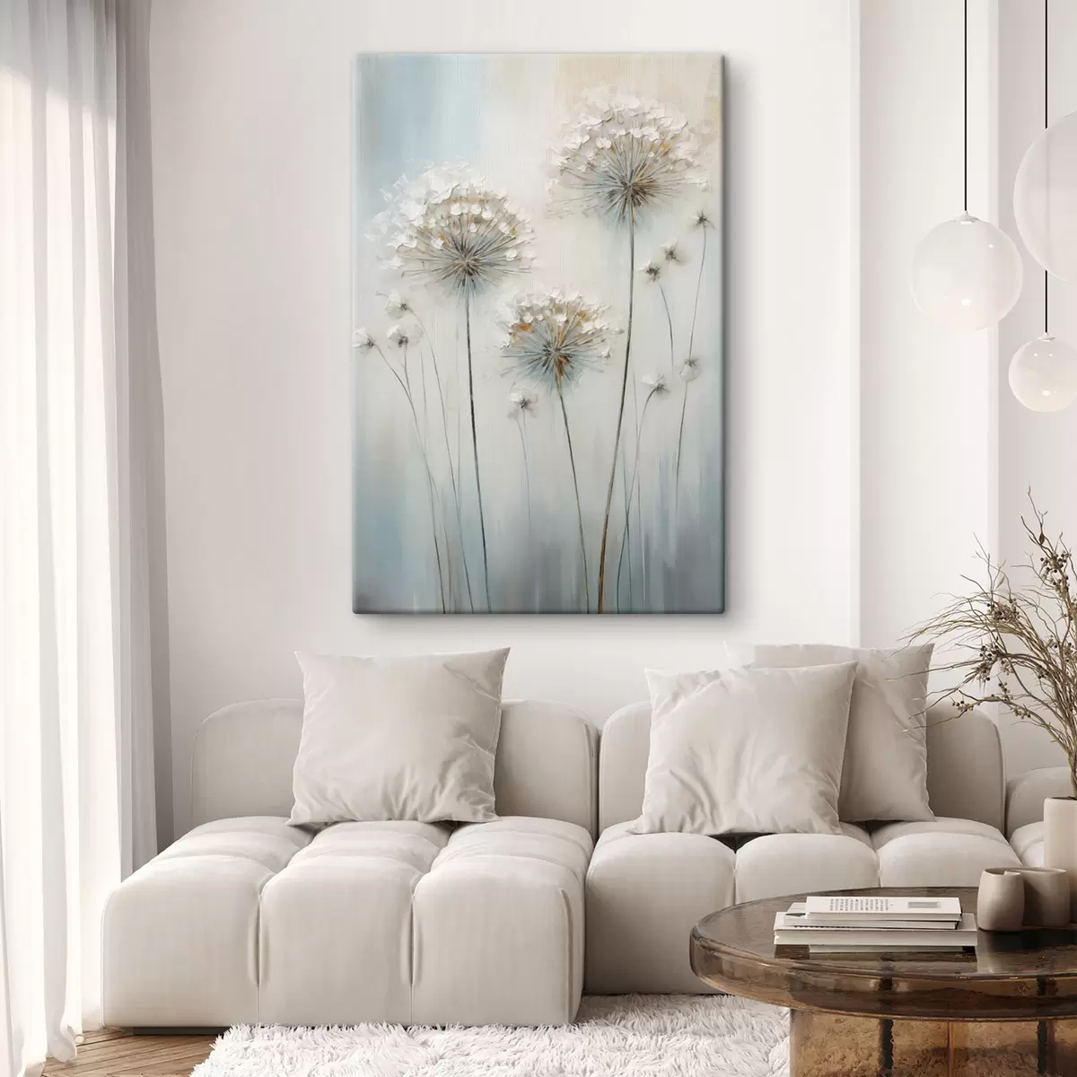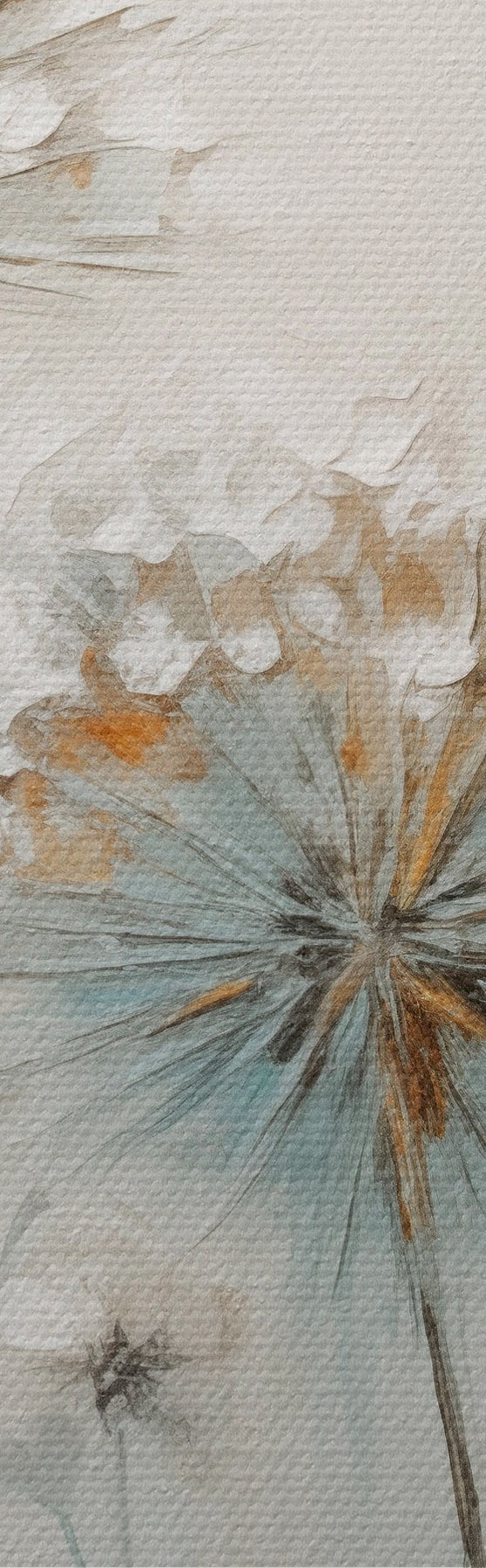 Schilderij Textuurrijke schilderstijl van paardenbloemen tegen een zachte blauw-witte achtergrond Art. s47855