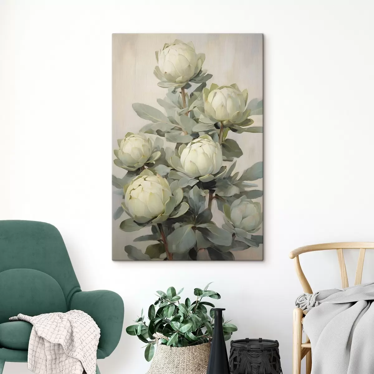 Schilderij Schilderstijl van verschillende witte proteabloemen met grote groene bladeren tegen een lichte achtergrond Art. s47861