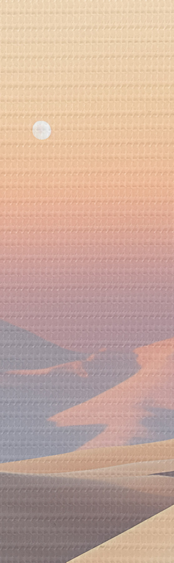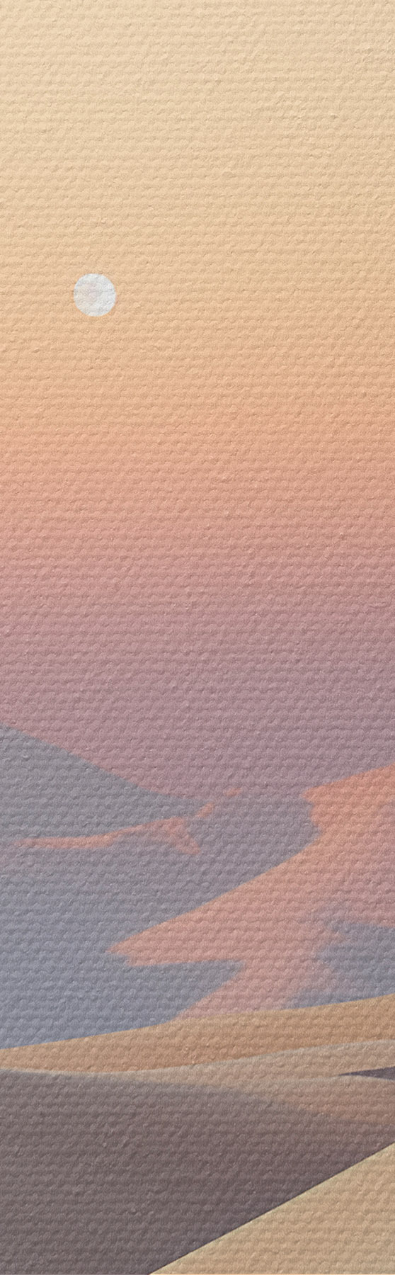Schilderij Een woestijnlandschap met glooiende zandduinen onder een zachte pastelkleurige lucht, met in de verte bergen op de achtergrond. Art. s47865