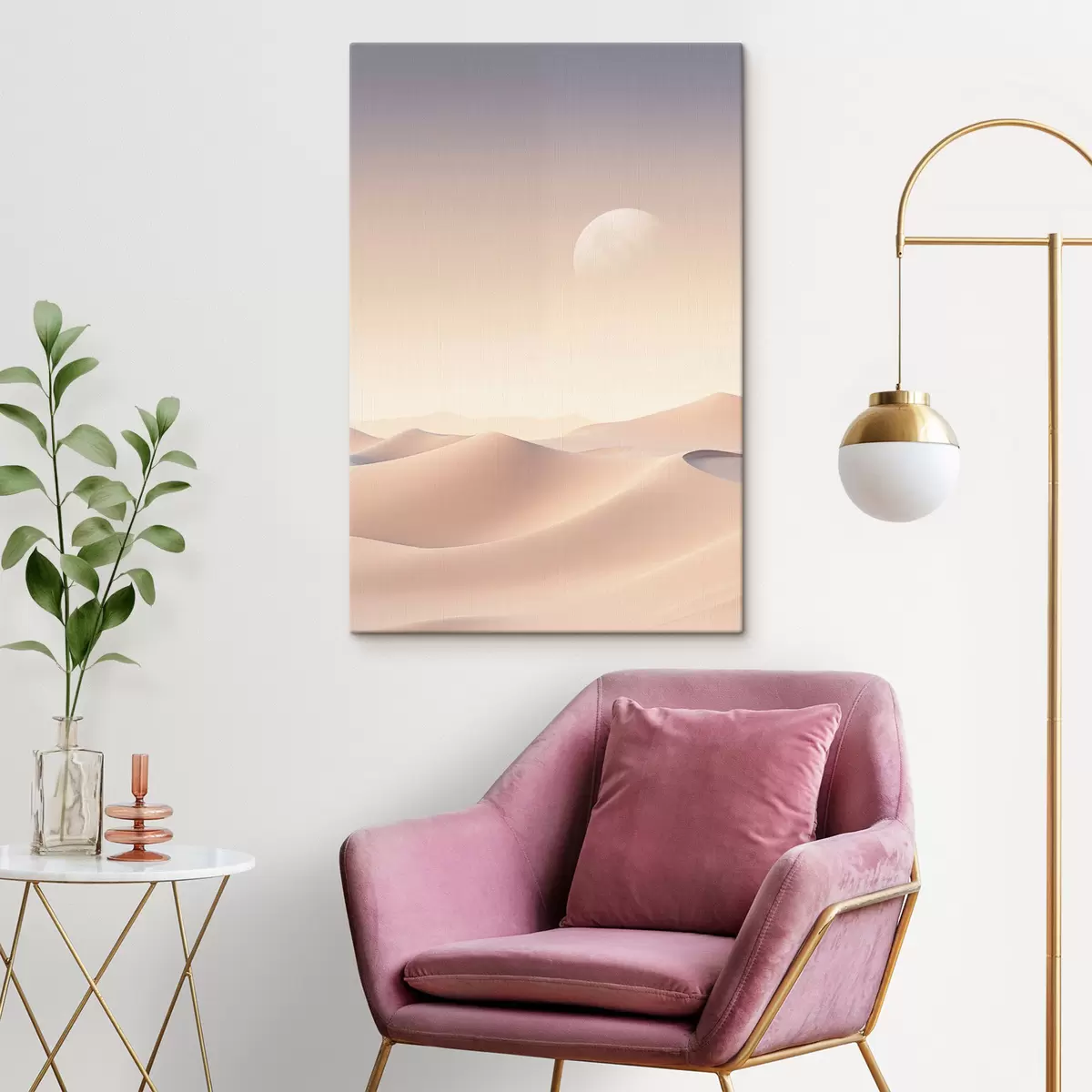 Schilderij Een woestijnlandschap met glooiende zandduinen onder een zachte pastelkleurige lucht, met in de verte bergen op de achtergrond. Art. s47866