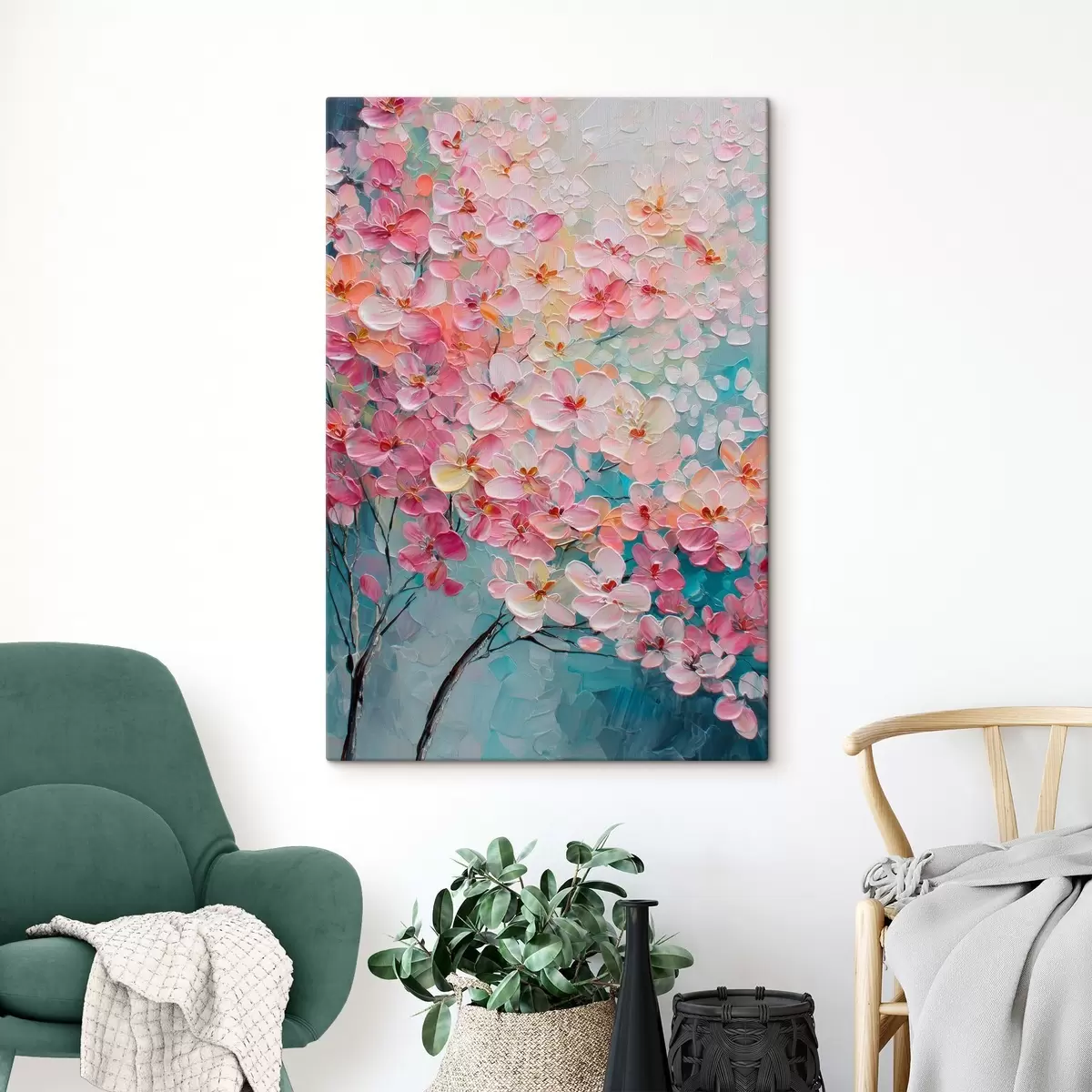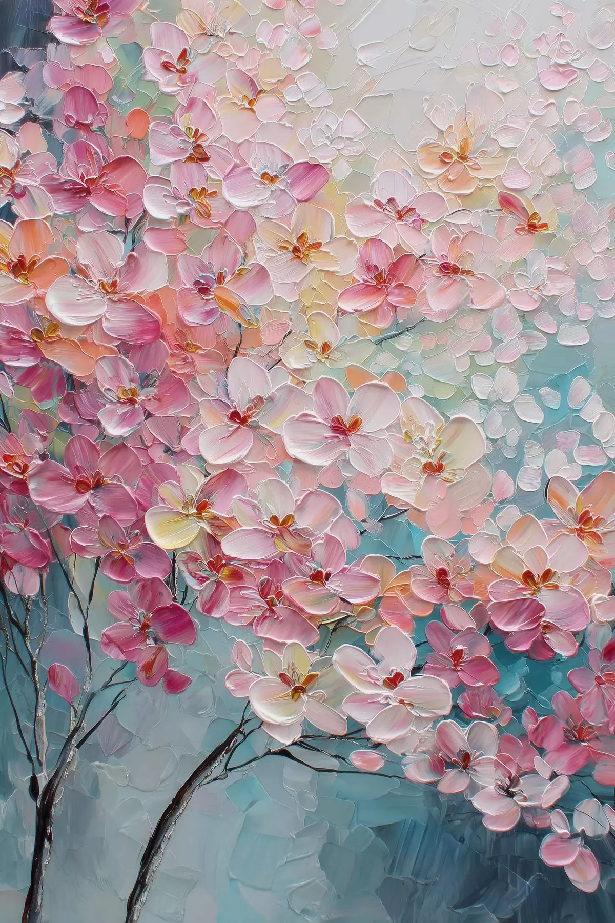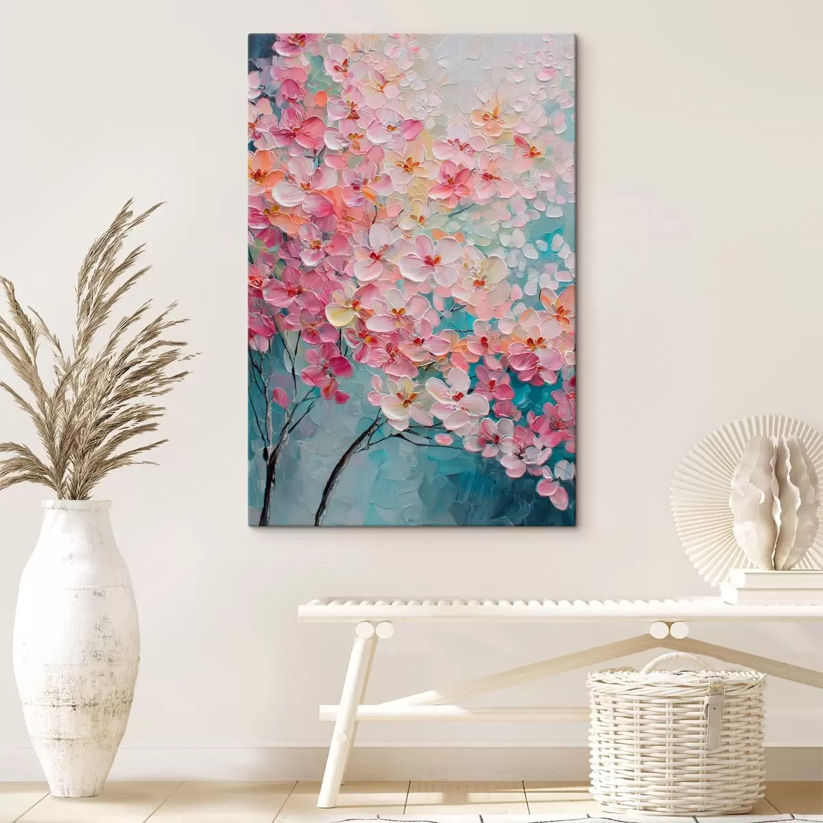 Schilderij Tak met roze bloemen op een blauwe achtergrond in olieverfstijl Art. s47987