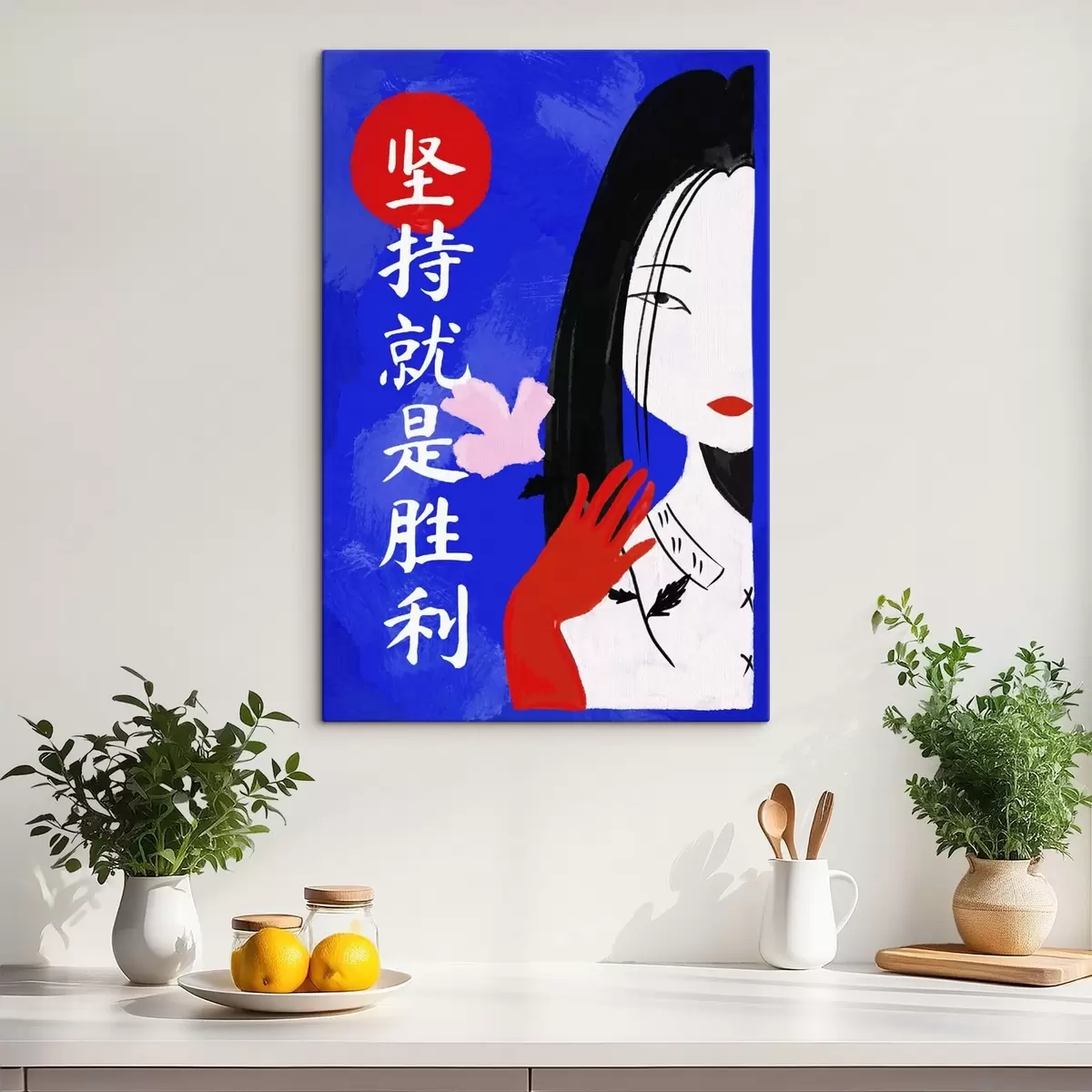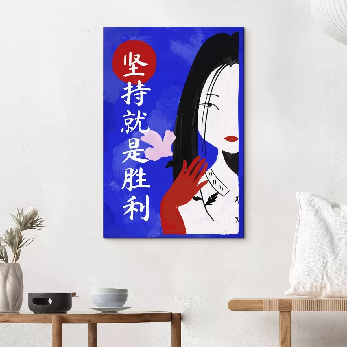 Schilderijen Gestileerd vrouwenportret met blauwe achtergrond en tekst s48032