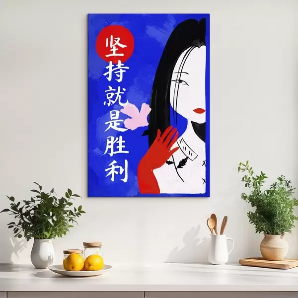 Schilderij Gestileerd vrouwenportret met blauwe achtergrond en tekst Art. s48032