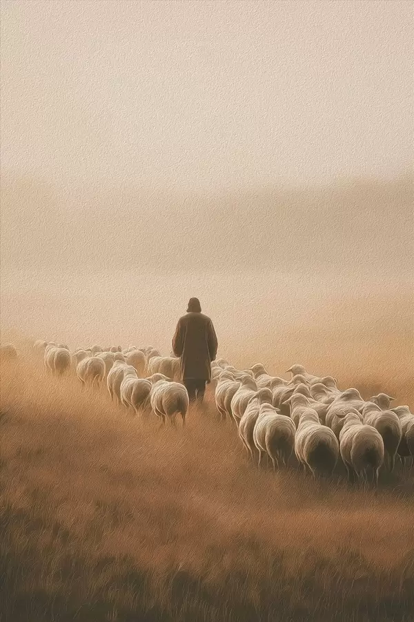 Schilderijen herder die met een kudde schapen in een open veld loopt s48077