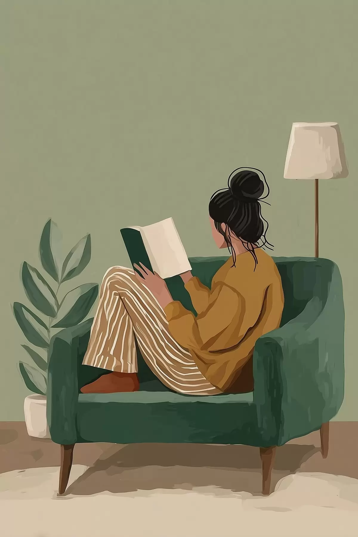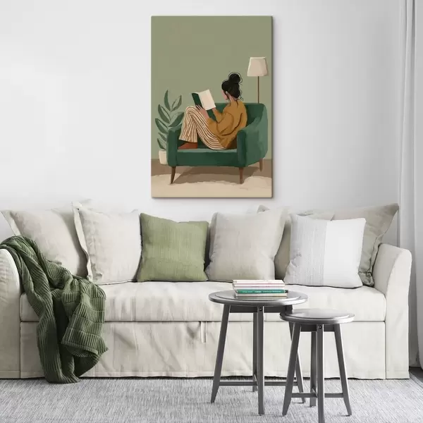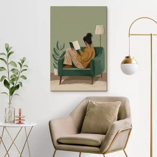 Schilderij Minimalistische, gezellige illustratie van een vrouw die in een fauteuil zit te lezen. Art. s48118