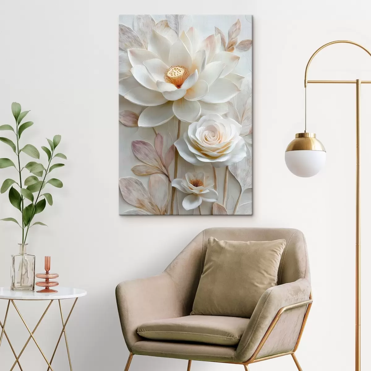 Schilderij Lotus- en rozenbloemen in lichte crèmekleurige tinten in olieverfstijl Art. s48214