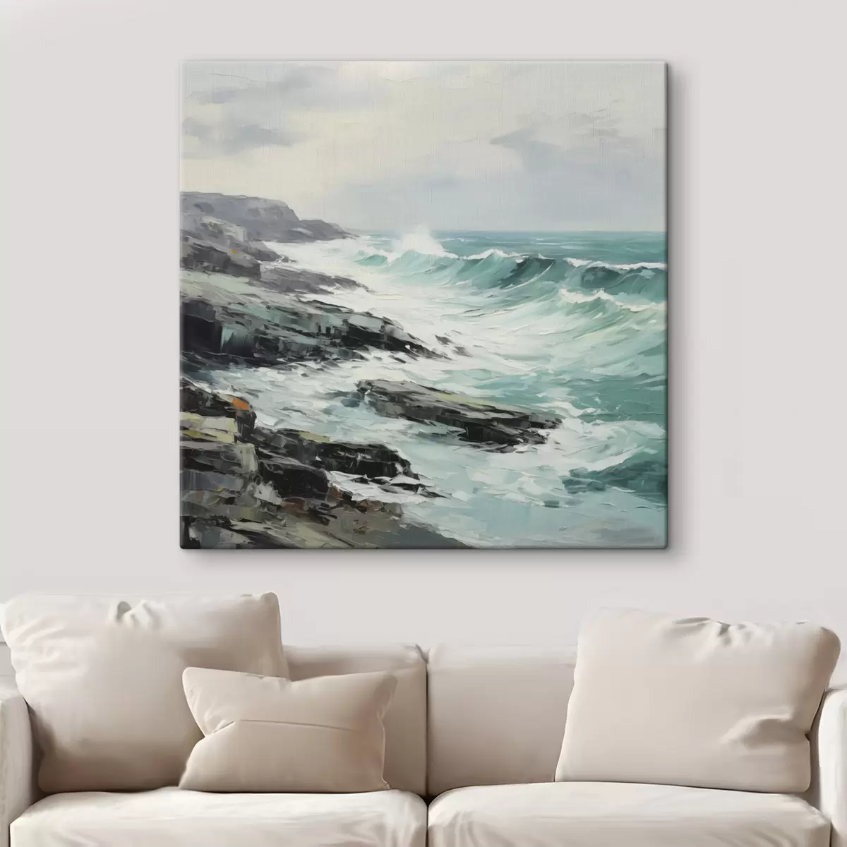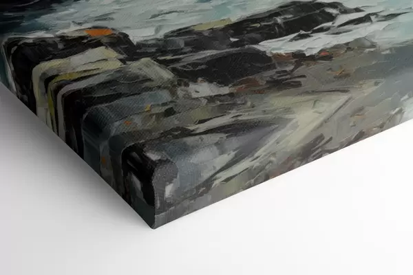 Schilderij Een rotsachtig kustlandschap met golven onder een bewolkte hemel, in schilderijstijl Art. s48387