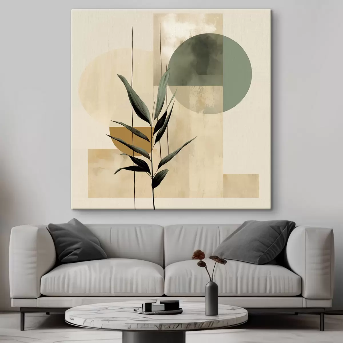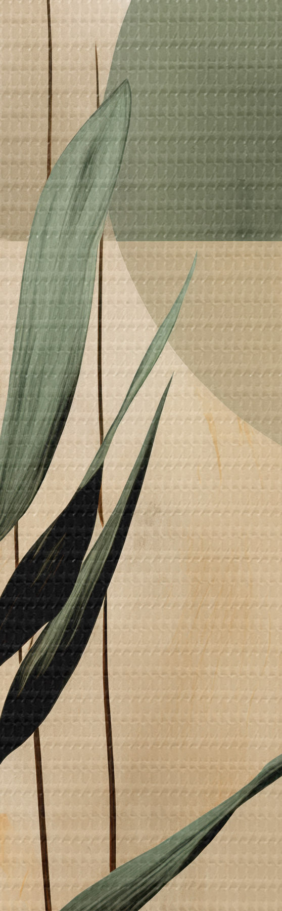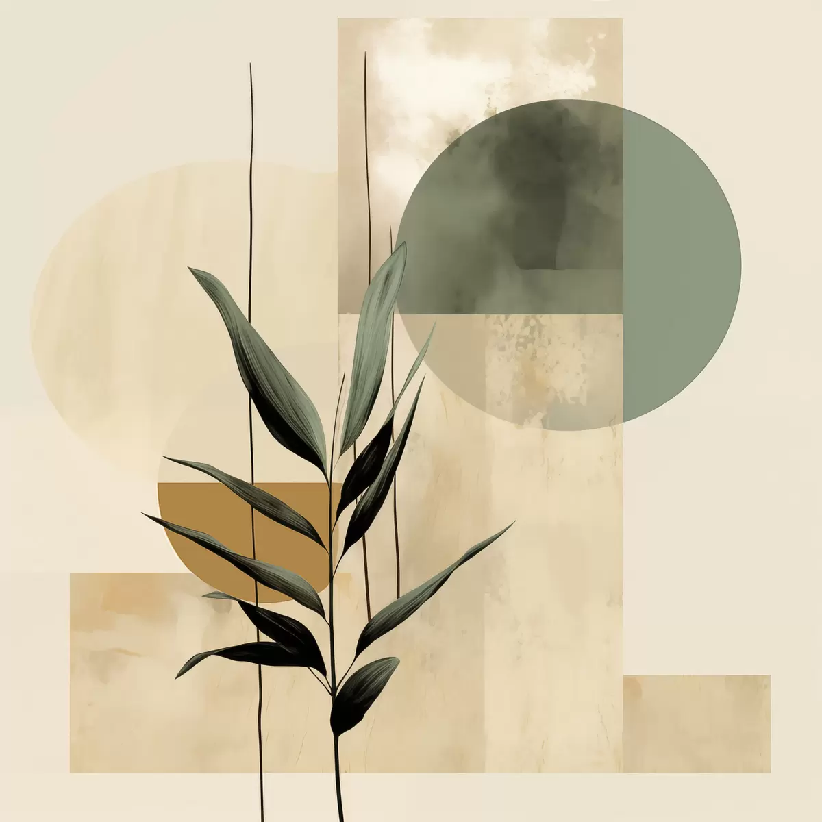 Schilderij Een donkergroene plant met abstracte geometrische vormen en aquarelachtige texturen in beige en groen Art. s48409