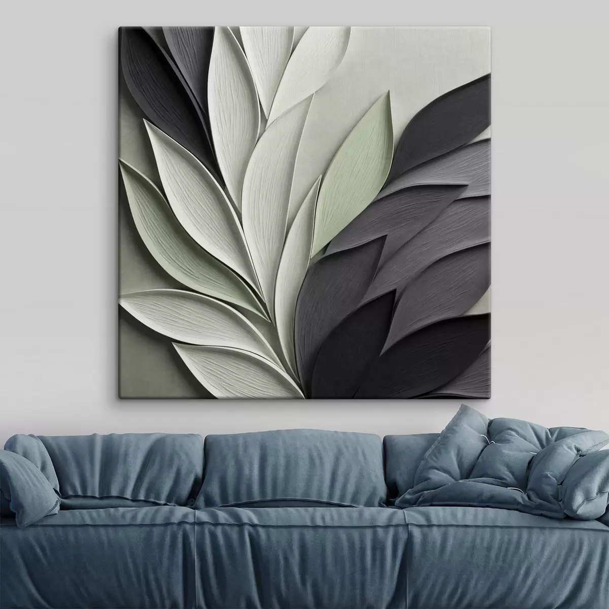 Schilderijen Abstracte, gestileerde bladeren in grijstinten, wit en gedempt groen s48411