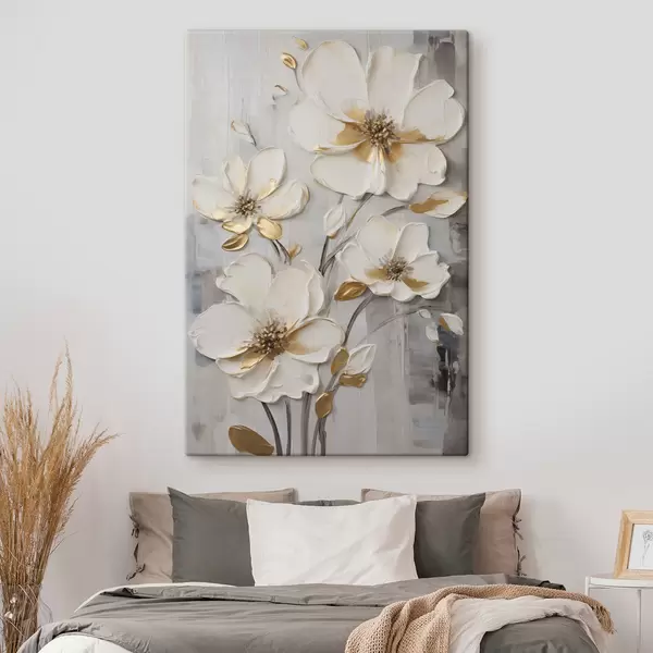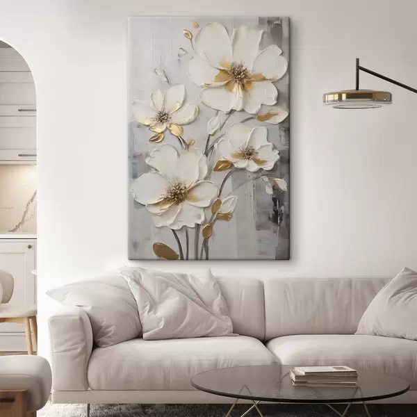 Schilderij Witte bloemen met gele accenten op een structuurrijke achtergrond Art. s48721