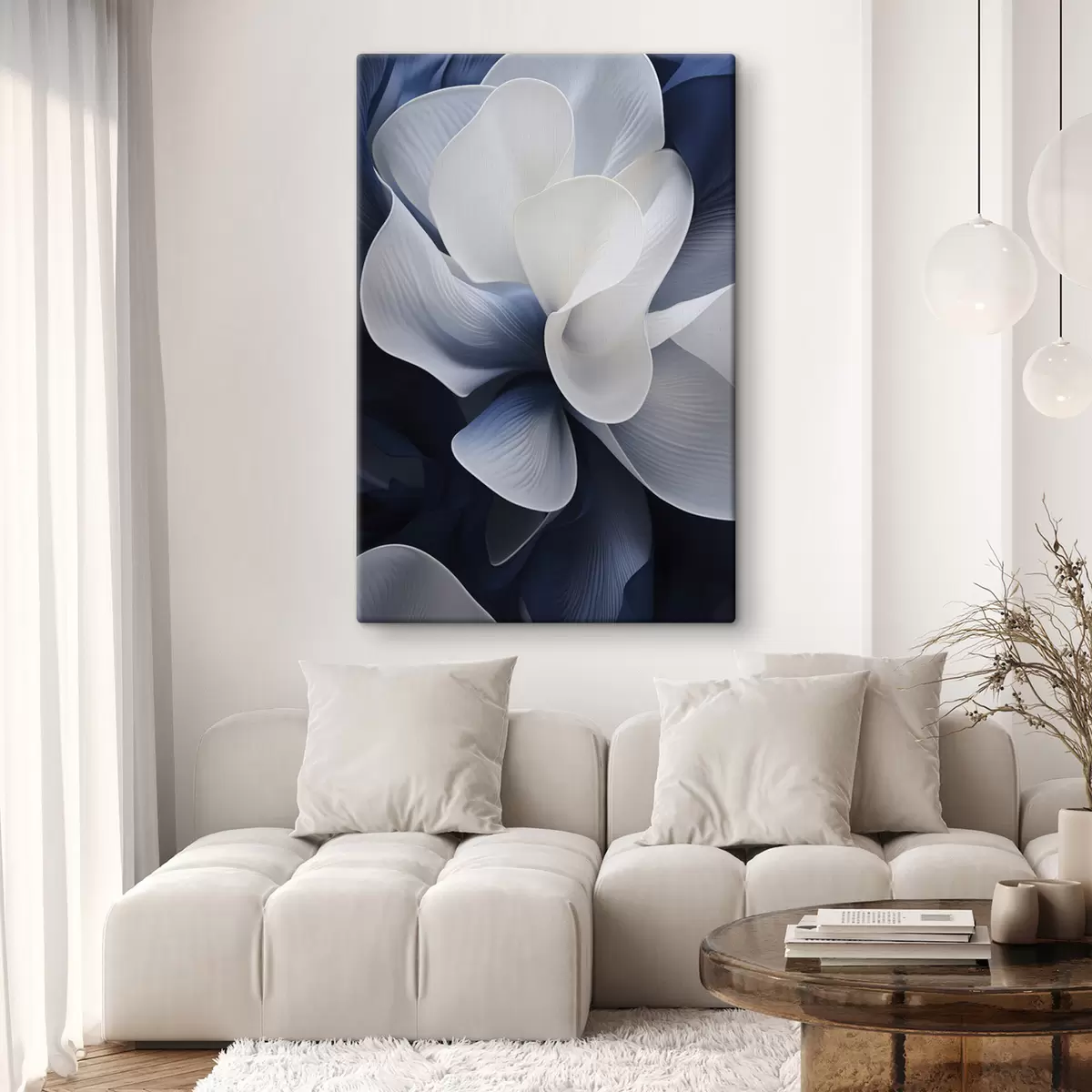 Schilderij Abstracte blauw-witte bloemblaadjes tegen een donkere achtergrond Art. s48732