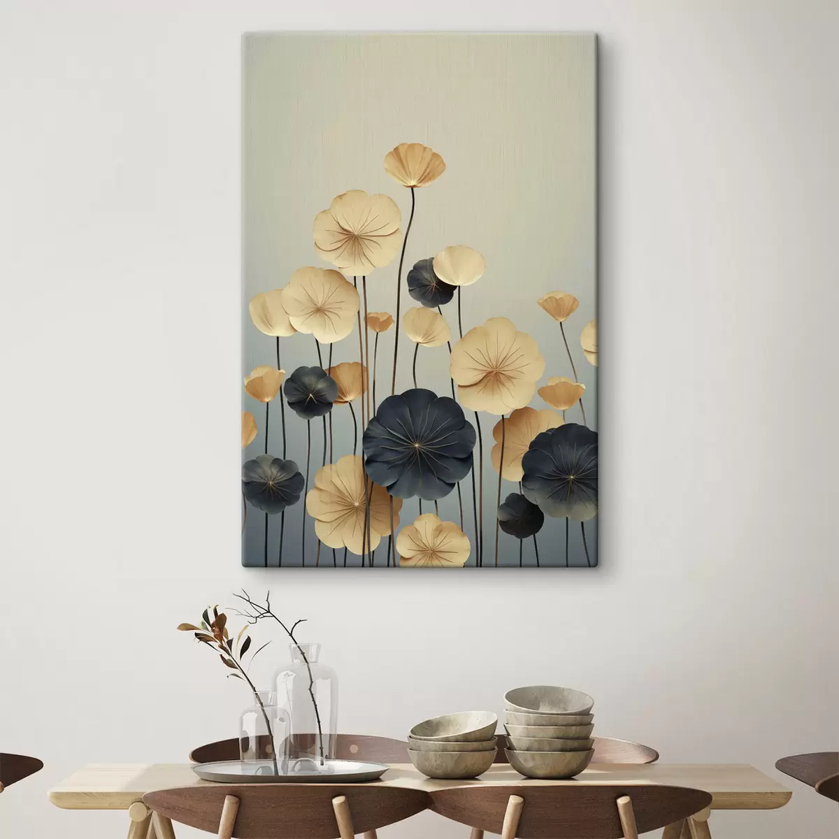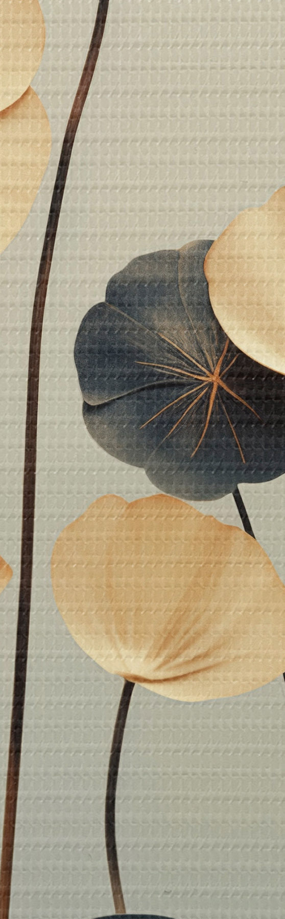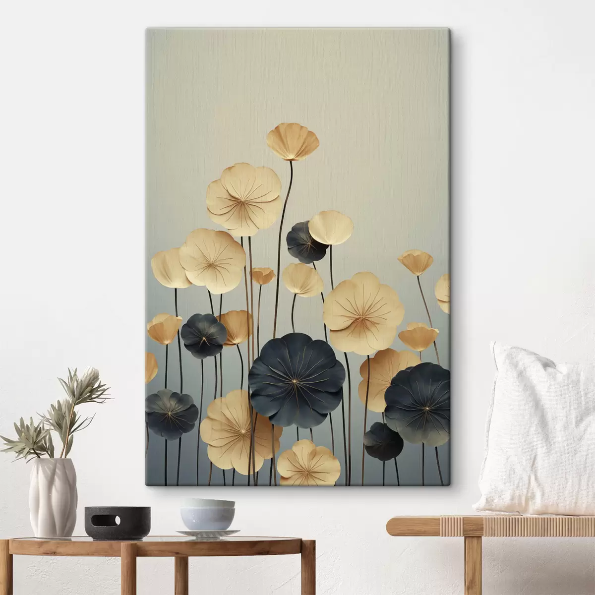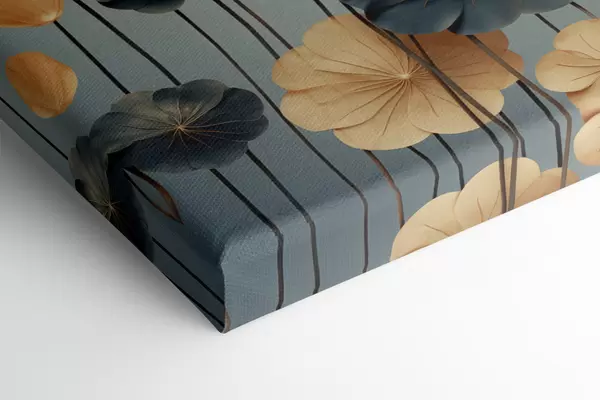Schilderij Waterlelieblaadjes tegen een ingetogen achtergrond van beige en donkerblauw Art. s48734